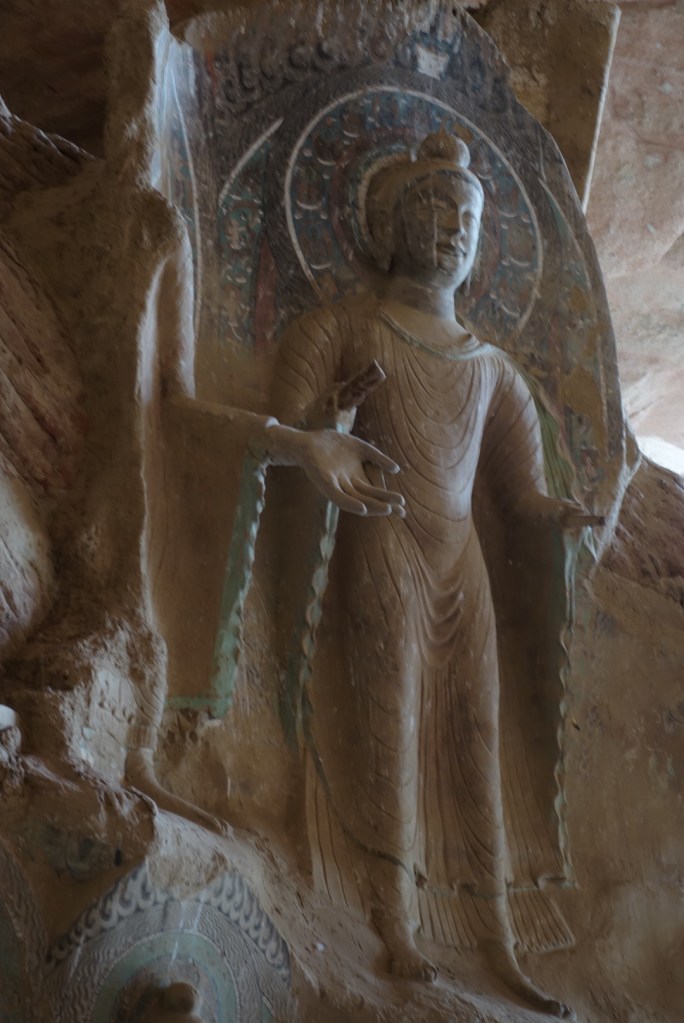 雲岡石窟的北魏佛像,粗壯結實,身上緊裹着有褶的服裝。後來變得苗條些,頭部及頸部幾乎是圓柱形的。眉毛彎彎,與鼻樑相接。前額寛而平,在太陽穴突然後析。眼是細長縫,薄唇,永遠微笑,下巴尖尖的。衣服不再緊貼而是披掛在身上,在腳踝處張開,左右對稱,衣褶尖挺如刀,像鳥翼似的張開(這時期的書法常有尖鋒)。雲岡有三派: (1)中印度色彩的,比較呆板僵定,刻法呈示摹仿的努力。佳者雖勇毅有勁,但缺乏韻趣,弱者多傖丑。 (2)佛容修表,衣褶質實而流暢。弱者質樸庄嚴,佳者含笑超塵,美有余韻,氣魄純厚,精神栩挧。刀削雕琢,平暢流麗,不過帶來煙火氣。這種創造,純為漢族藝術,已無印度痕跡。 (3)第三洞三巨像一例,雕刻藝術在精神方面乃大大退步,在技藝方面則加增諳熟繁巧,講求柔如曲綫及圓滑。