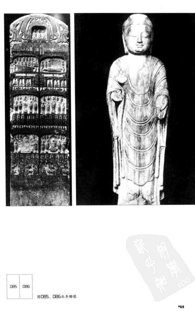 北齊雕像全身各部以管形為主,衣裳極緊,衣褶僅似线紋,頭笨大,胸高肩闊,上大下小。與北魏相比,其律韻遲鈍,手足笨重,輪廓無曲线,上下直垂。突變原因來是西域或印度,或用西域工匠,佛像用新式,故印度秣莬羅之影響十分明顯。