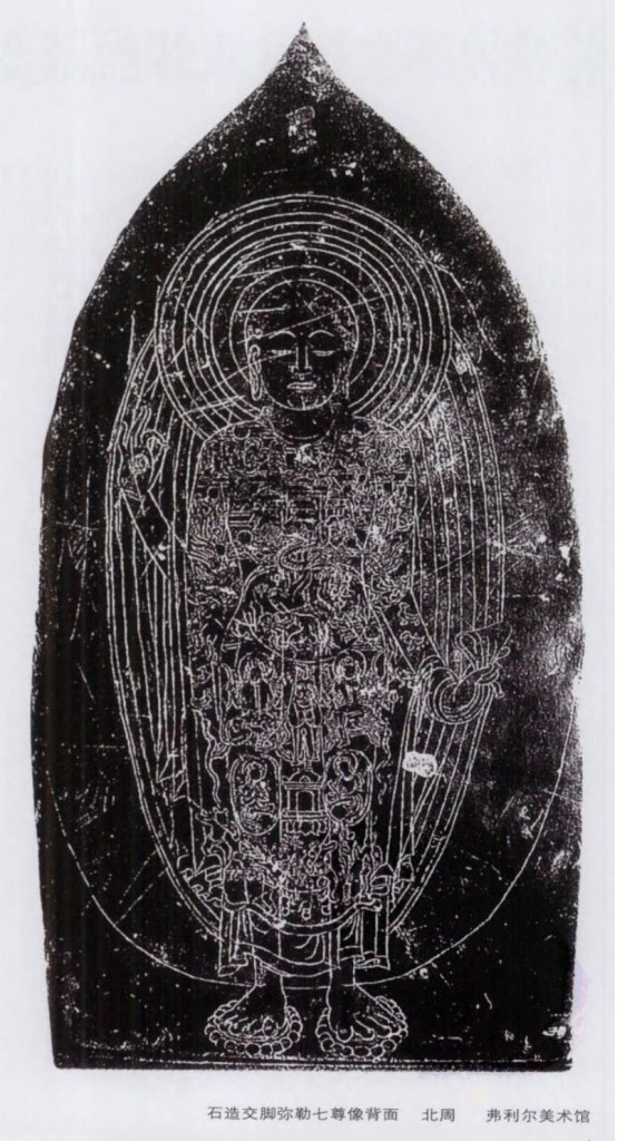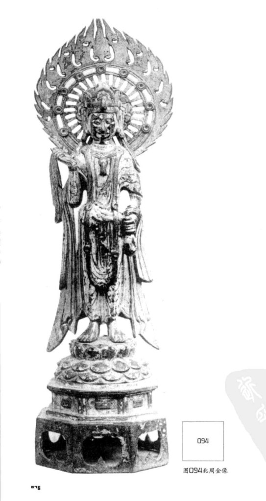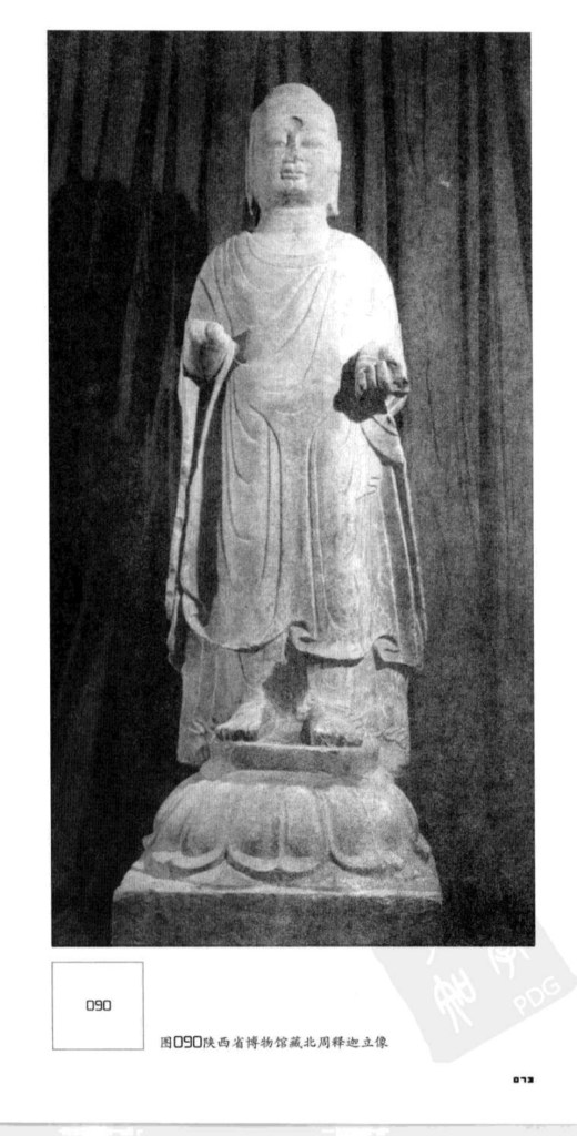 北周遺物,以陝西為多,比起齊,受印度影響極微,故保存魏風。佛身肥咋,衣褶寛暢下垂。