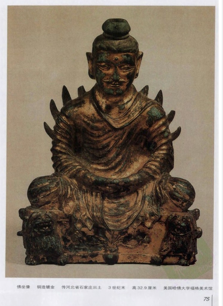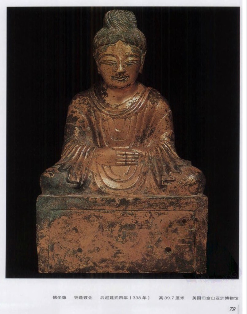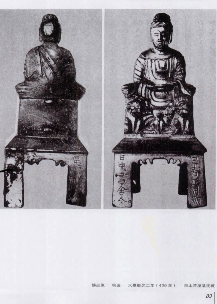 南朝 造像現存極少:陶齋舊藏元嘉十四年銅像。高約一尺三寸,兩肩覆袈娑,似健陀羅,然技術上毫無印度風,面貌姿態乃至背光皆為中國創作,唯戴安道所創之南朝式也。 華盛頓 Freer Gallery 蔵元嘉二十八年銅像,背光作葉狀,上鎸火焰紋,有三小佛浮起。