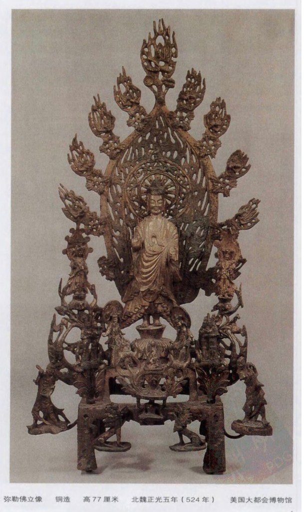 北魏正光五年金銅彌勒佛立像,二尊出土于河北省正定府,現在美國大都會美術館。有銘文確認年代。