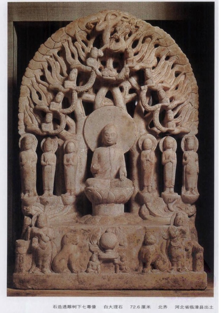北齊石造透雕菩提樹下七尊像,河北省臨漳縣出土。飛天所握的華蔓亦稱花繩、花圈,原是希腊愛神愛洛斯所持握的,故在犍陀羅中亦可見,貴霜時期秣菟羅也有。