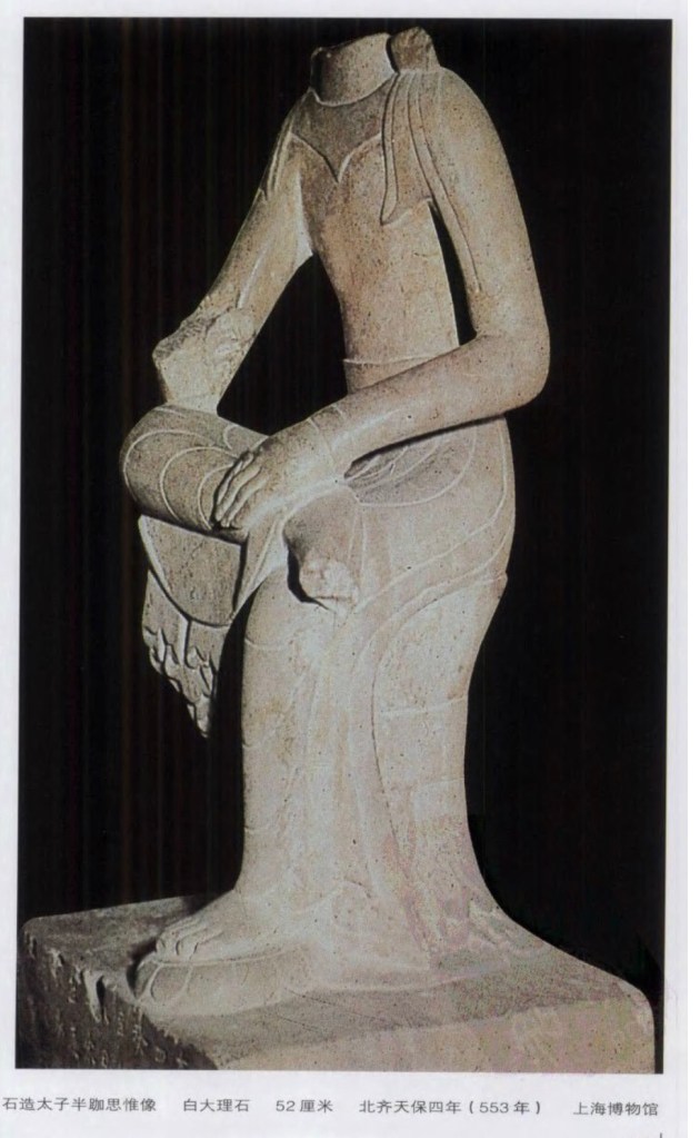 半跏思惟像,就北魏時期的,似乎都稱以彌勒,亦有稱以太子的。自東魏、北齊起,卻盛行有銘文的思惟像,有太子像之文,令人知道是釋迦為太子時的太子思惟像。