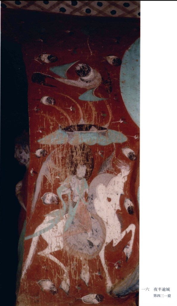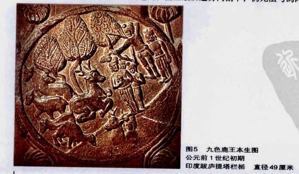 (3)九色鹿 釋尊降生為鹿王,有九色,世上稀有。曾救一溺水者並告知不要洩露它的住所。此時王妃夢見一九色鹿,並告之國王欲得此鹿。王以金銀封地為獎賞,曾被鹿王救起的溺者,進宮說出鹿王的所在地。這時,他臉上突然長滿癩皮。國王找到鹿王正欲射殺之際,鹿王說出遇溺昔之忘恩負義,國三大受感動便放過鹿王。回宮後王妃知道情形,就一下心碎而成。