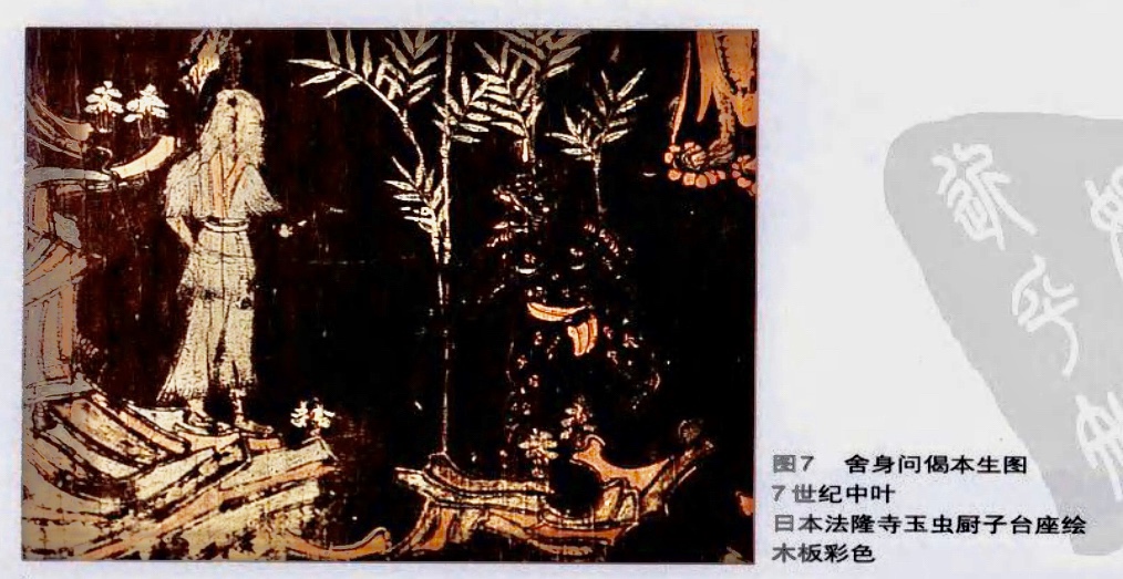 (5)摩訶薩埵王子 與兄至園林游既,見一母虎因生日七子,困于飢餓,母子即將絕命。太子遂別離二兄,獨自走至母虎前面脱了衣服讓其吞食。然母虎太弱無法起身就食,太子便以乾竹剌頸並從山上投身於虎前。母虎才得以舔食血肉,即舍身飼虎。