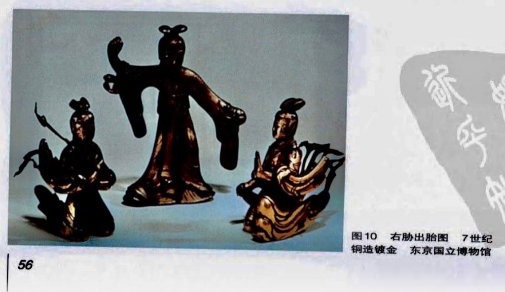 (3)右胁出胎 摩耶夫人一懷起菩薩便心身安和。四月八日到無憂樹下,舉右手欲摘其枝葉時,菩薩便從夫人右胁出世。