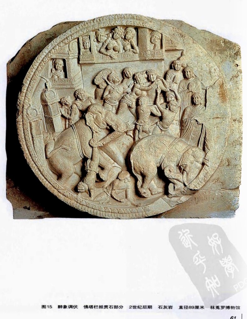 (8)醉象調伏 釋尊與提婆達是叔甥關系,然提婆達非常嫉妒怨恨釋尊,常設計陷害。其中一招是趁釋尊行乞之時,使眾象飲洒,以瘋狂醉象踐踏釋尊。但醉象衝到佛前卻感到佛之威德,不僅沒有傷害反而長跪佛前,舔舐如來之足,最後悔過歸順。