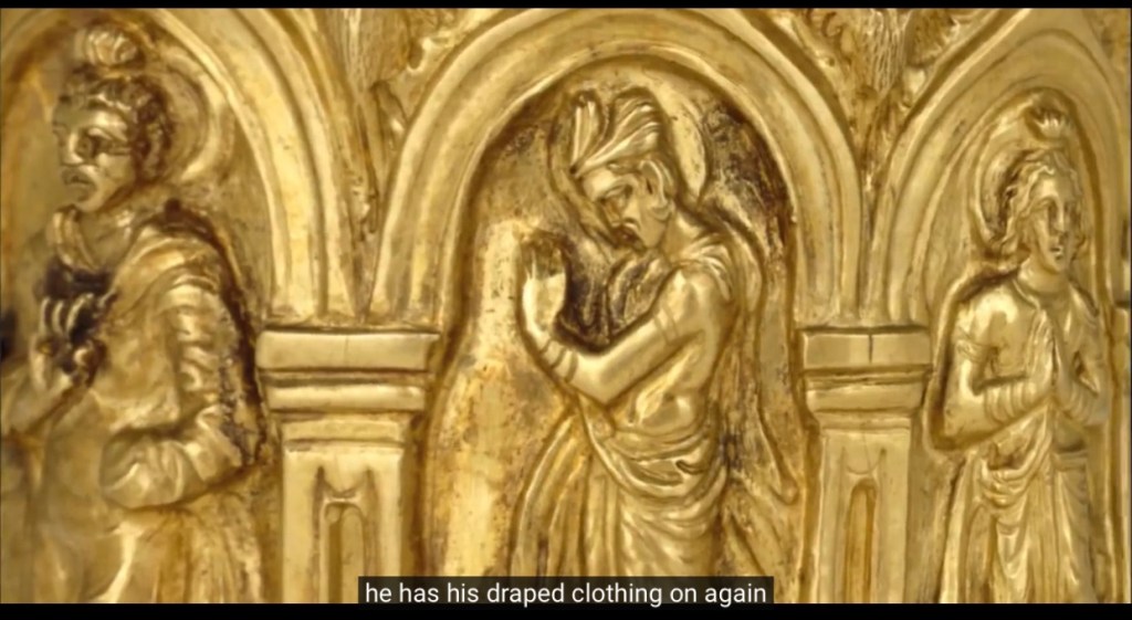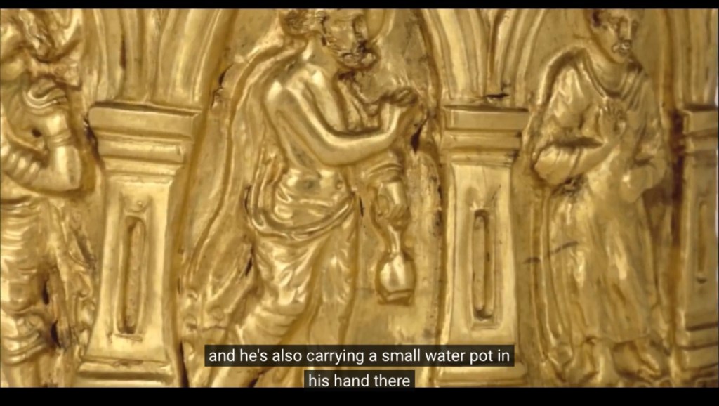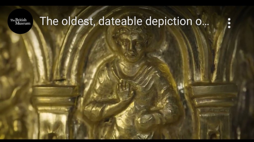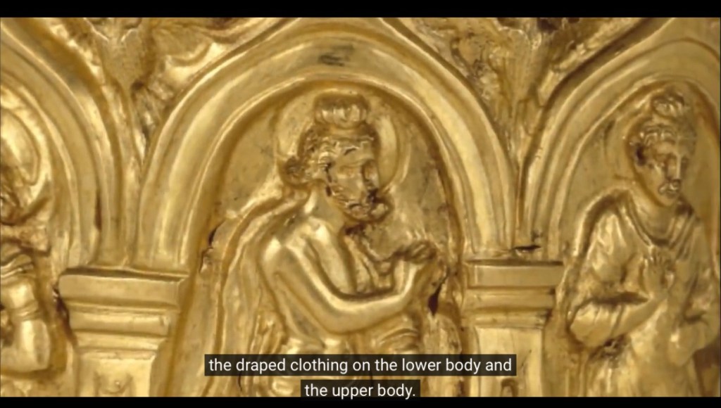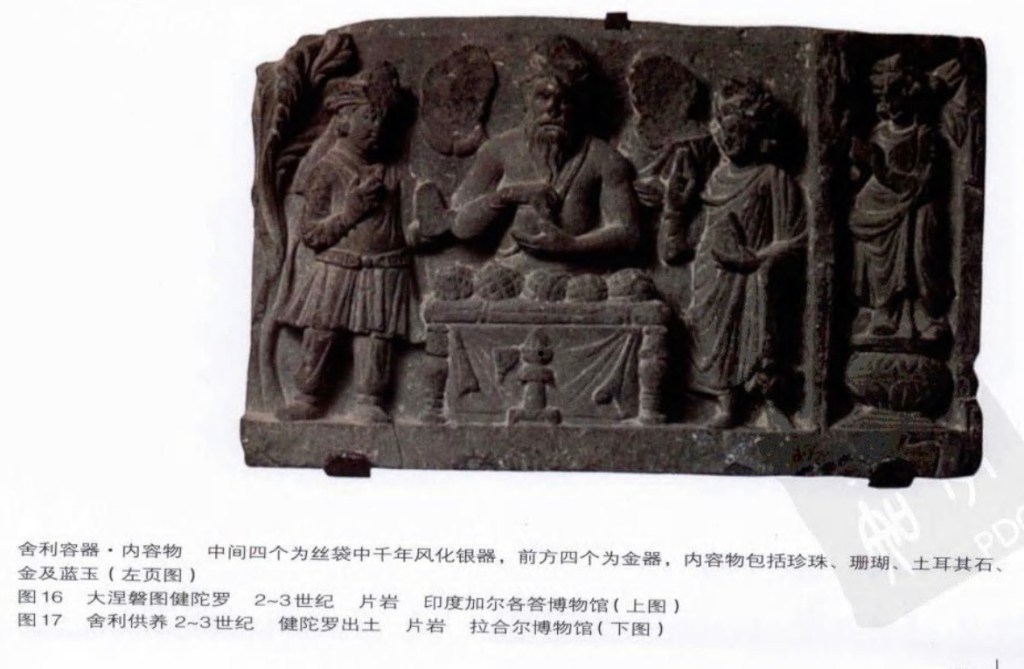 最早的佛陀像,出土在健陀羅的一個gold casket. 佛陀在中間,右邊是梵天,露上身,髮束成高髻,手持水瓶。左邊是因陀羅,王子般装扮。