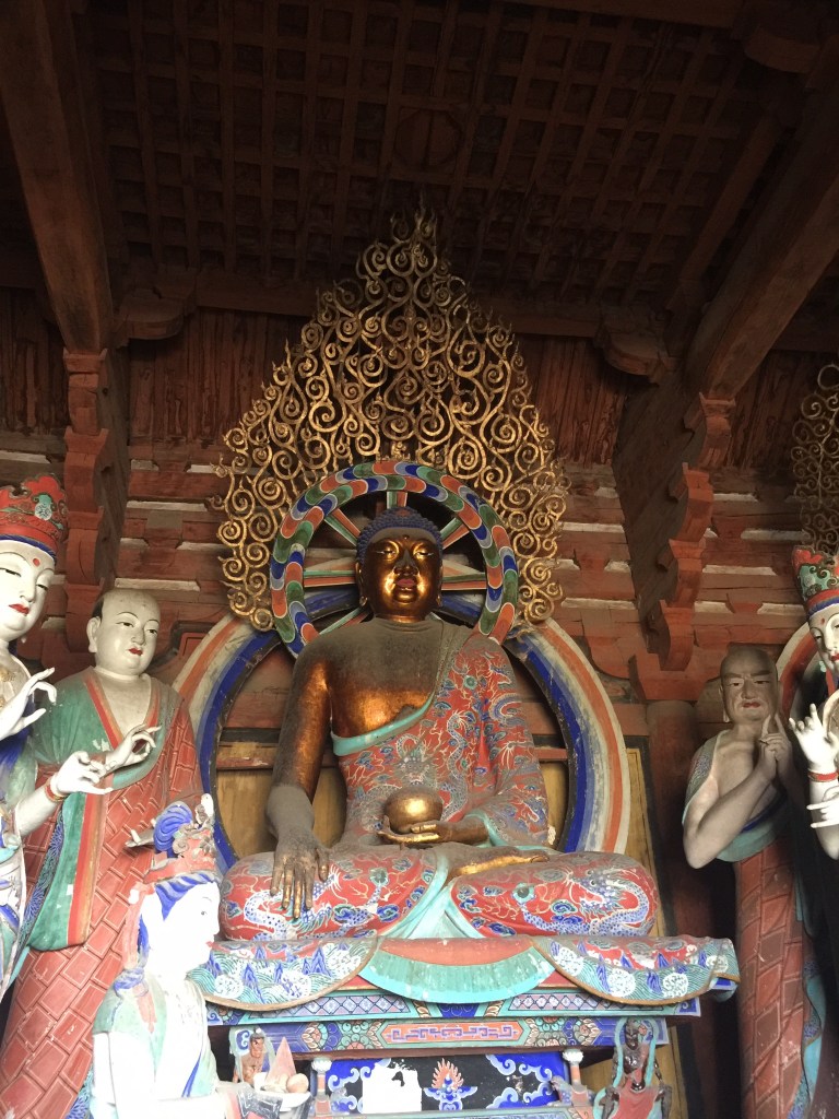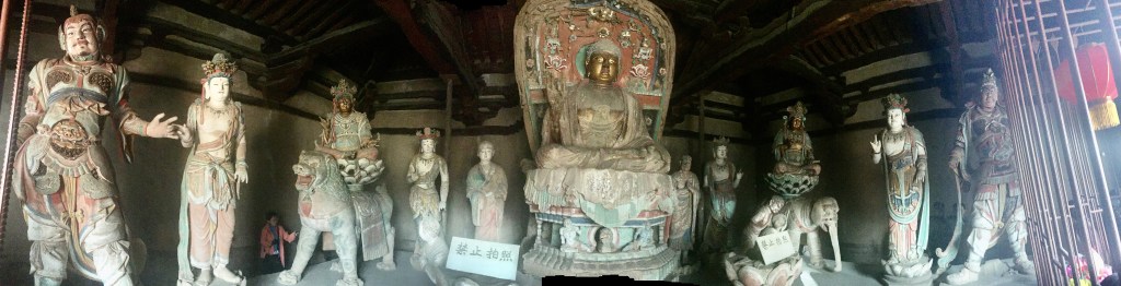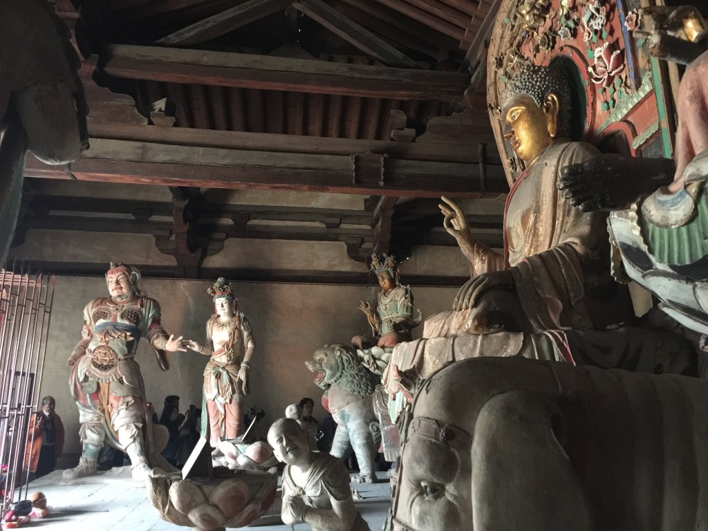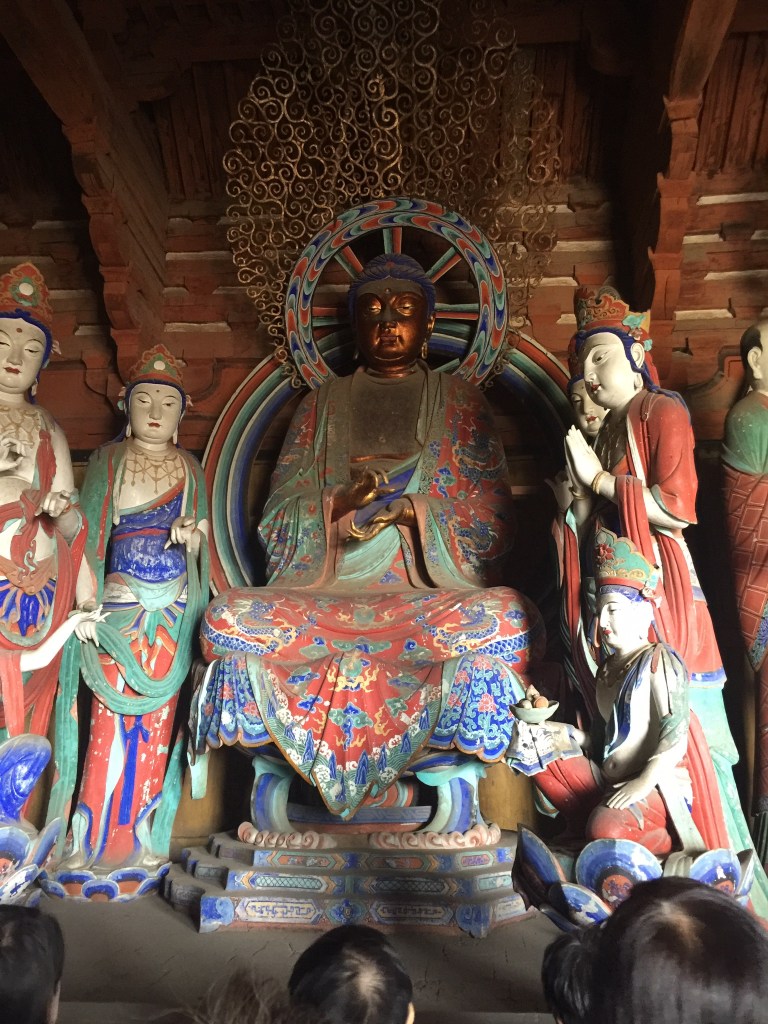 佛光寺:面頰豐滿,弧形彎起的眉毛,端正囗唇。彌勒及阿彌陀佛腹部的衣褶和帶結與釋迦和阿彌陀垂在覆坐上部的衣褶,都是唐代的固定程式。