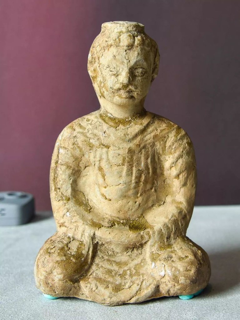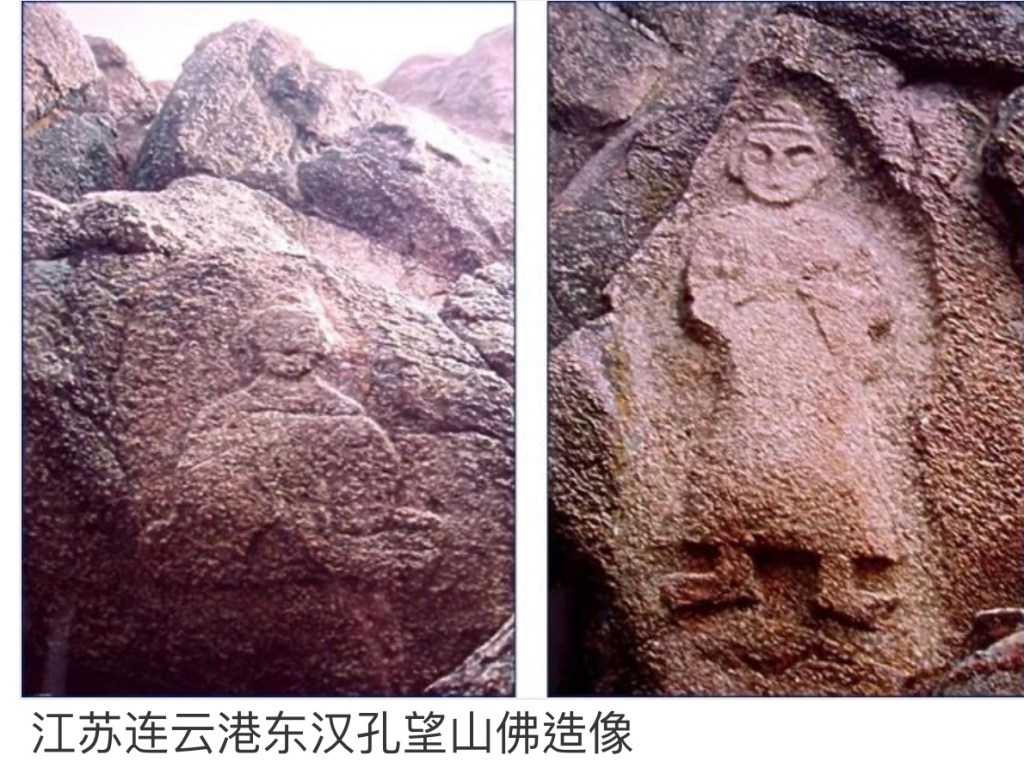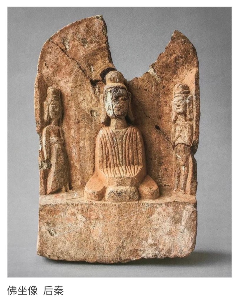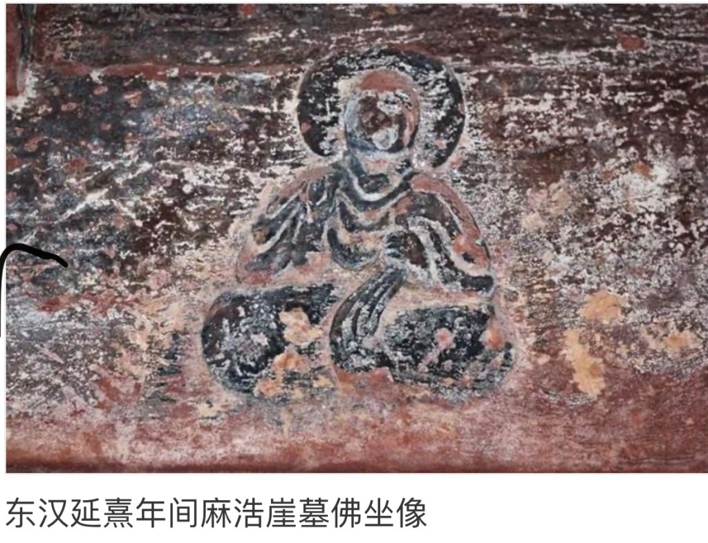 中國最早的佛像,一般說法是出現在東漢,那時候佛教多被視為黃老道術的一種,與中國傳統神袛並行祭祀,只是滿天神佛其中一之一,所以並沒有獨立的佛像。很多依附在搖錢樹的柱柄上,或在墓壁晝中佔一席位。按基形態及衣服,完全是犍陀羅式的做像如下 👇