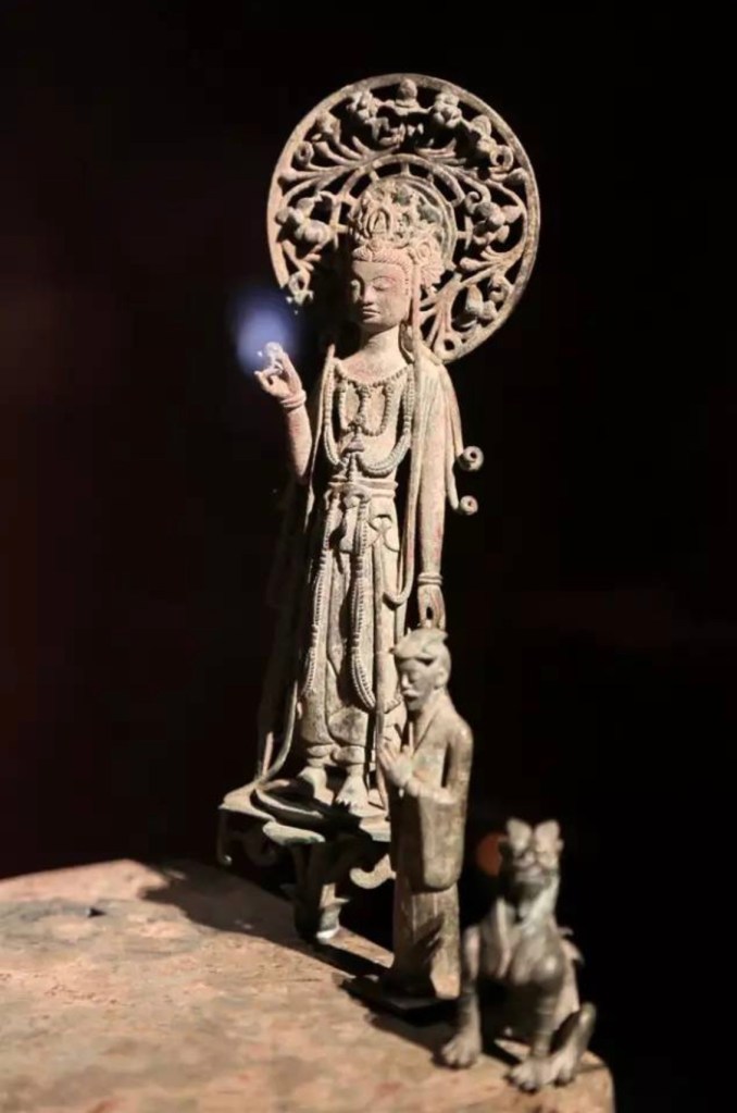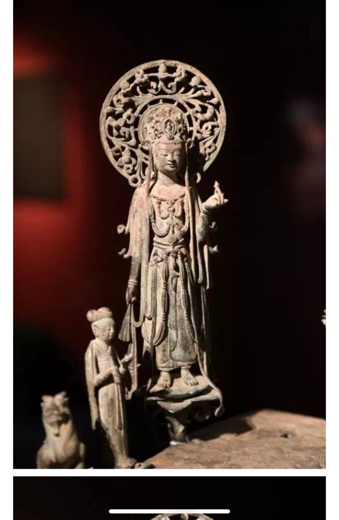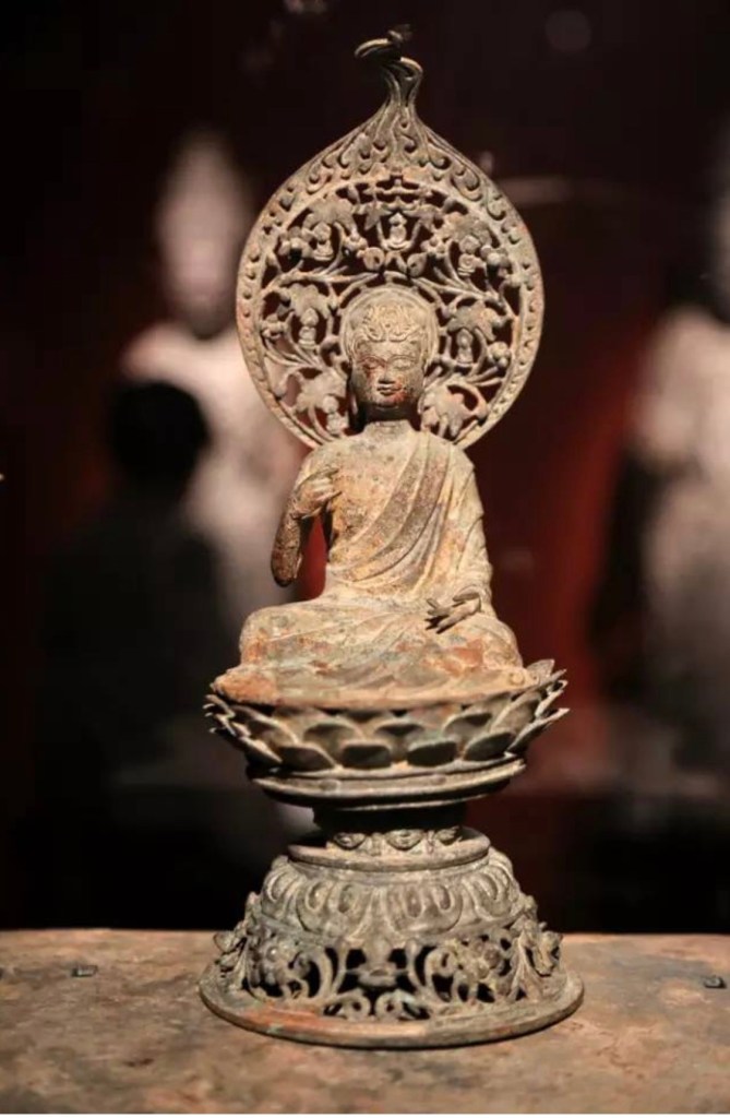 此期銅像亦足以助証其蛻變之程序。較早作品衣褶仍有魏風,身格較纖幼,曲線流暢,然頭部則方笨,現出北閨本色,且無背光,只有頭光。周齊以來,銅像背光已消滅,此時印度佛像也多無背光,所以可能是受其影響。
