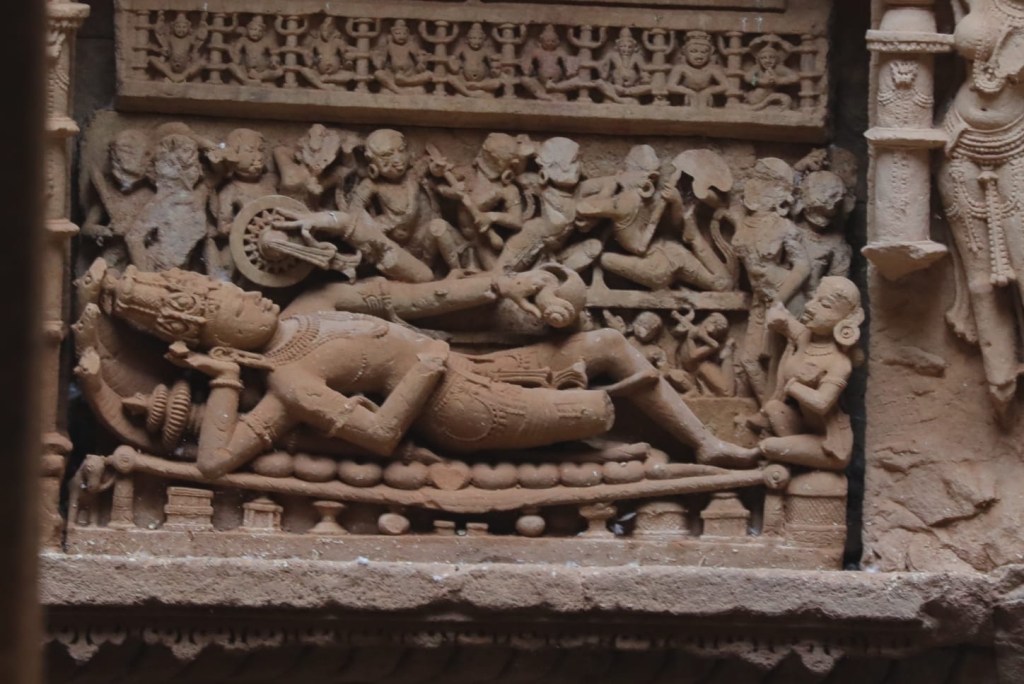Vishnu sleeping on Shesha 正常右手已斷,另一右手托頭,旁邊可見到他的錘,兩左手拿鐵餅及海螺。頭巾是五個蛇頭,Lakshmi給他按腳,梵天出世 (看不清)。背景是他的助手和惡魔搏鬥及崇拜。