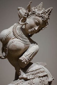 Apsara 飛天女神 是印度神彽之一,從攪乳海中出現,後來嫁了天庭樂師乾闥婆,隨夫在天界中起舞。其名有水中浮動之意,所以也含水之仙女 nymph. 形象多變,一般有吹笛、舞蹈、唱歌及遊戲。中國有伎樂飛天,所以我們更有共鳴。