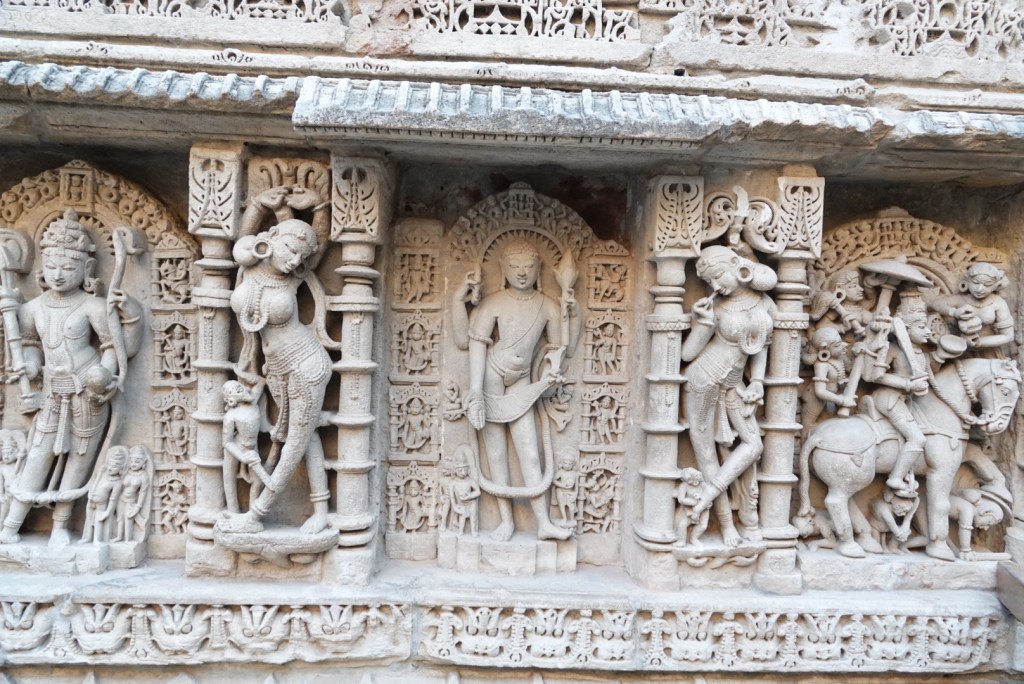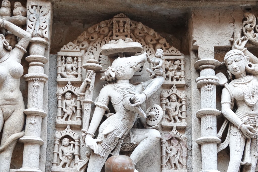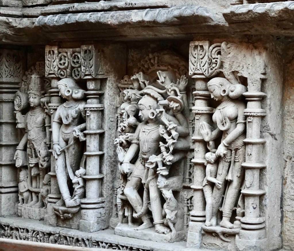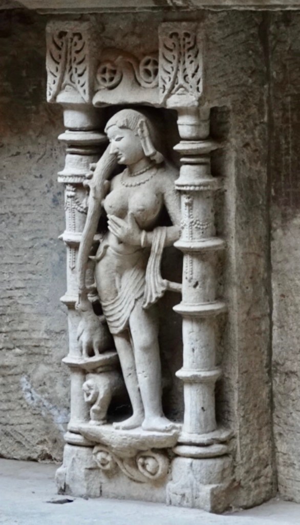 Dakinis 空行母 除了飛天之外在皇后階梯井還可以見到一種女神:空行母,地位比飛天高一些。常見於神龕兩旁,中間是主神,兩旁便是空行母。她們主要是在人類修練的時候,維持身、心及𤫊的平行。她們有特別的一種手印 Mudras 以維持身體五種元素的平𧗾:拇指-火,食指-空氣,中指-天,無名指-土,尾指-水。