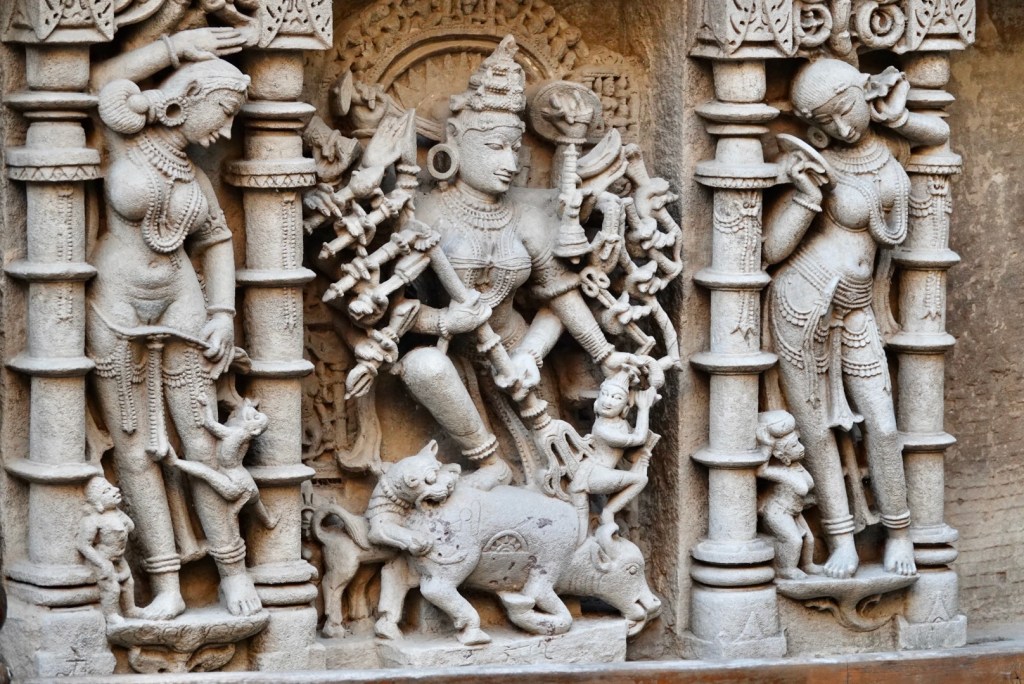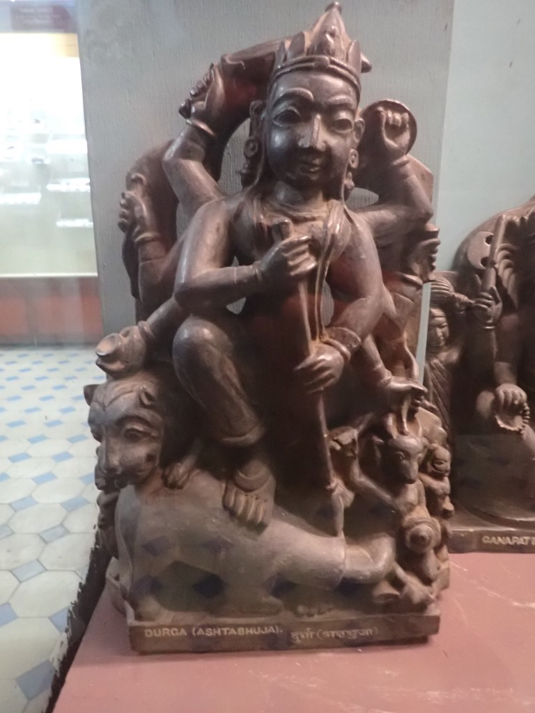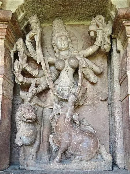 Durga Mahishasuramardini 殺水牛魔的場面。她左腳牢固在地上,右腳踏著水牛魔,牠辛苦到舌頭突出,其人形真身現於頭部。Durga 的獅子則從後面襲擊。