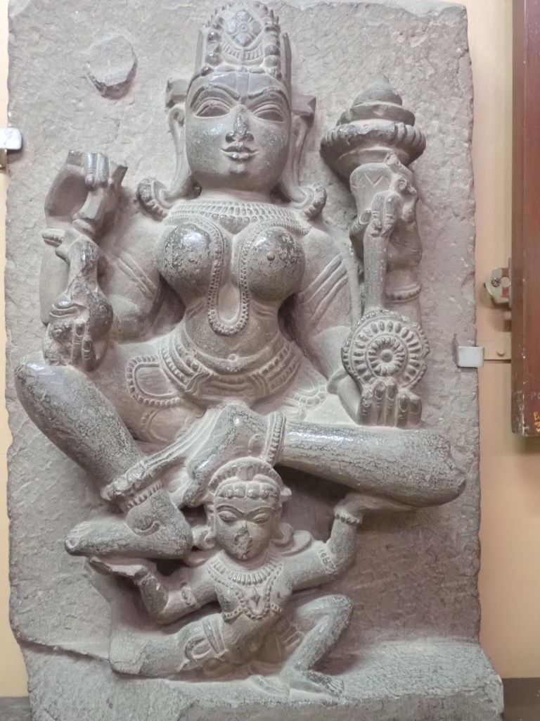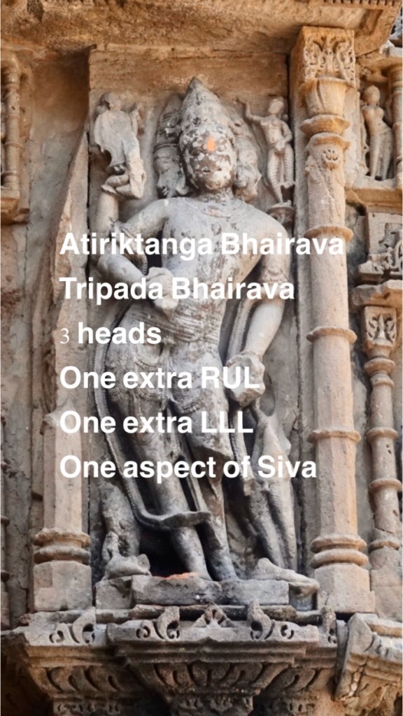 In Modera sun temple there is a rare statue Atiriktanga Bhairava, an aspect of Siva. 3 heads, 3 arms and 3 legs. The natural right hand holds a sword. The extra right hand holds or supports, on two of the fingers bent inwards, a double curved dagger, with a ridge running along the entire curvature. The solitary left hand is lowered holding a skull cup.