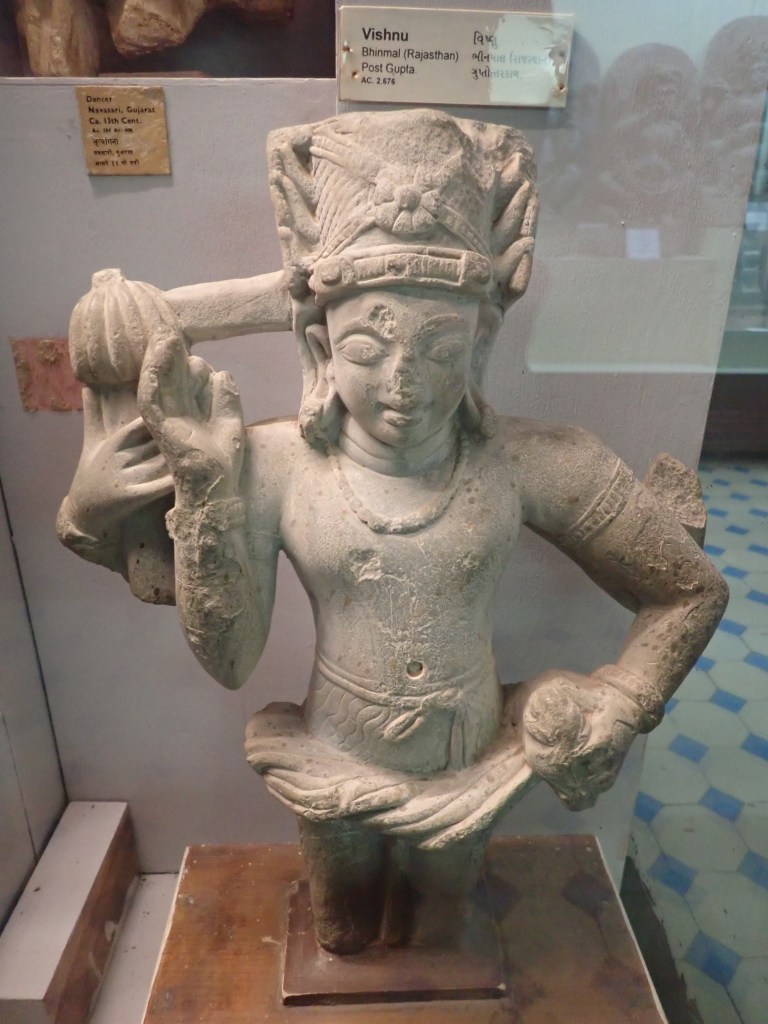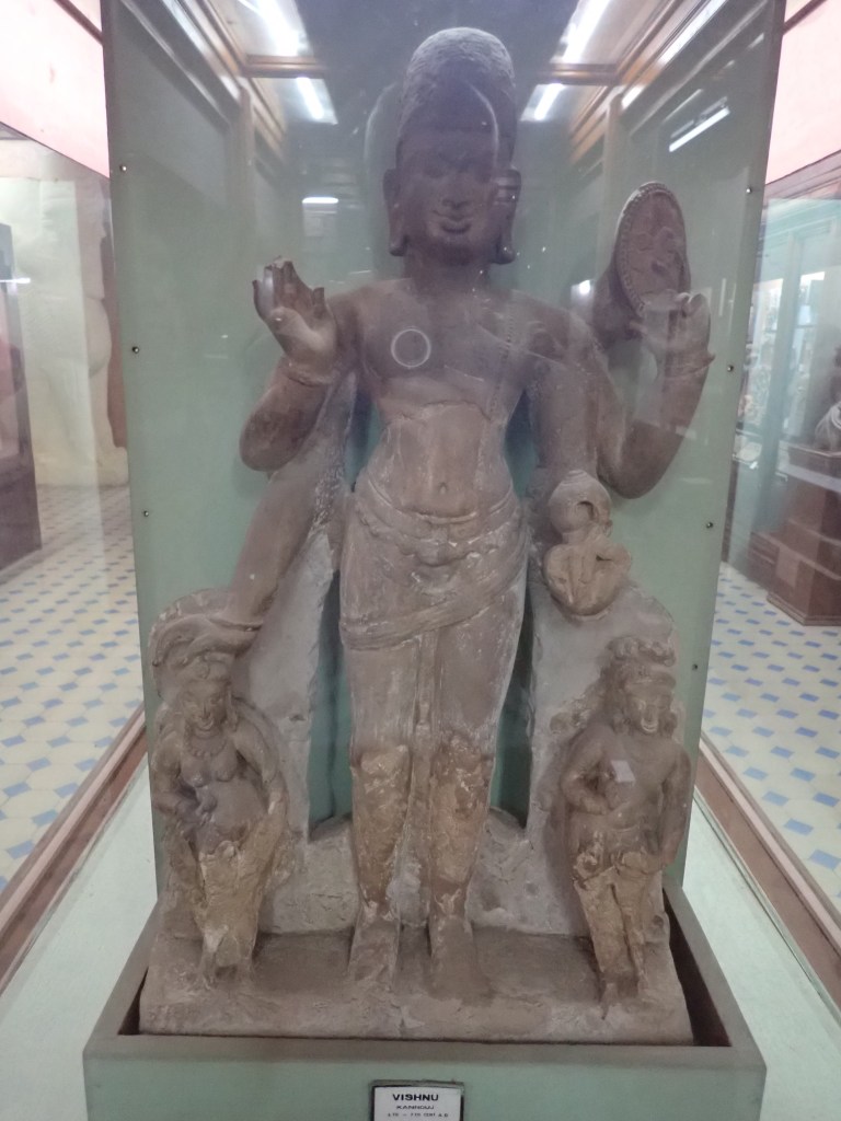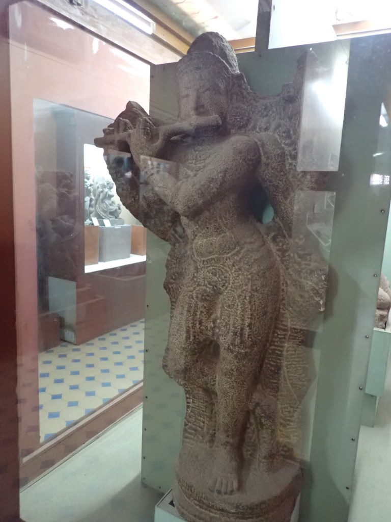 Buddha 佛陀, Vishnu 的第九個化身,身形瘦削,腰部只係一小布,上衣也很短,明顯肩帶。坦露右肩。頸繋寸珠頸鏈,一條花環長達腳部。螺髮,頭部突出顯非凡人,耳珠長達肩,有耳墜。右手施予印加第二珠寸及蓮花。