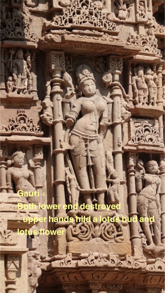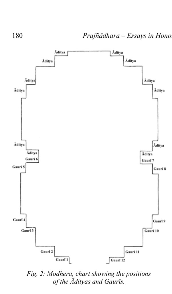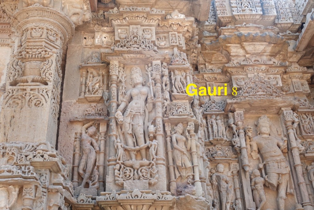 Surya and Adityas Surya 在梵文是太陽,Adityas 則指12個太陽神,每月一個。但作為單數的 Aditya 便等同 Surya, 兩者都泛指太陽神。Surya 通常形象是站在馬車上,雙手持蓮花。馬匹數量由一至數匹,最常見是七匹。衣著是典型的太陽神祗:高靴、頭戴高冠及穿金屬盔甲。Modera太陽神廟除了供奉太陽神之外也供奉濕婆,在神廟外牆除了有齊12個 Adityas 之外,也有12 個 Gauri (如上)