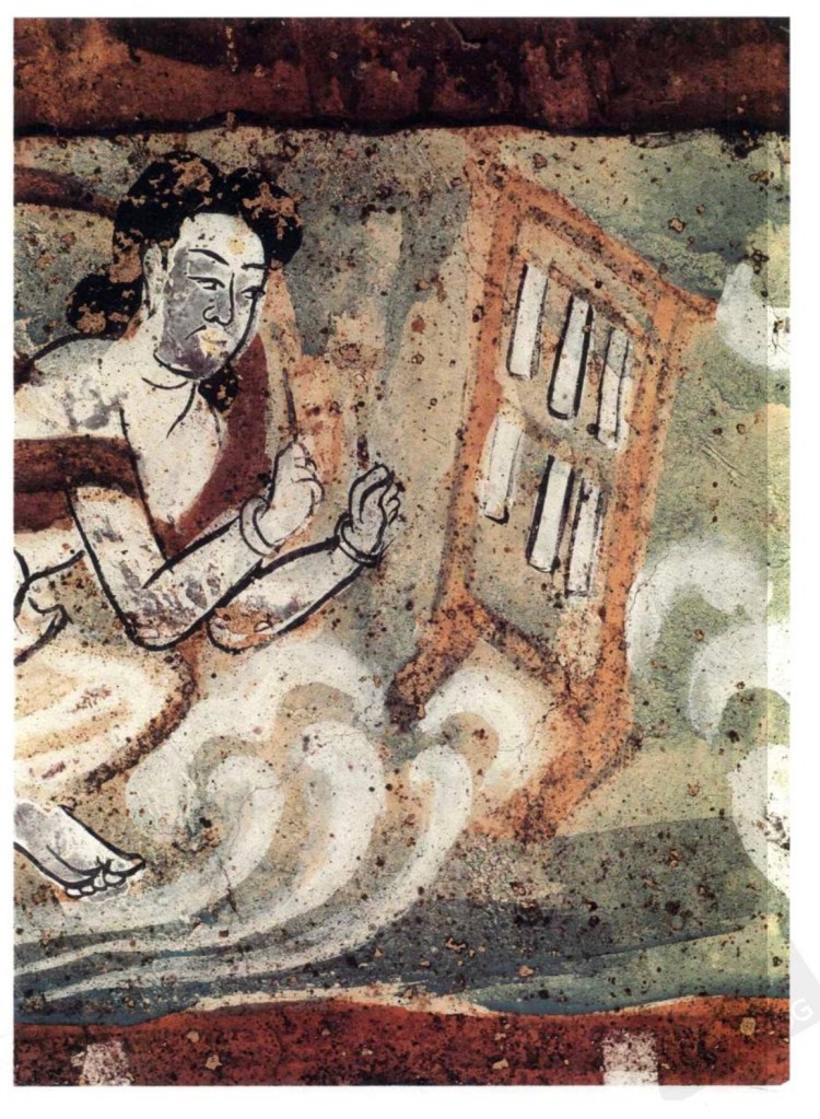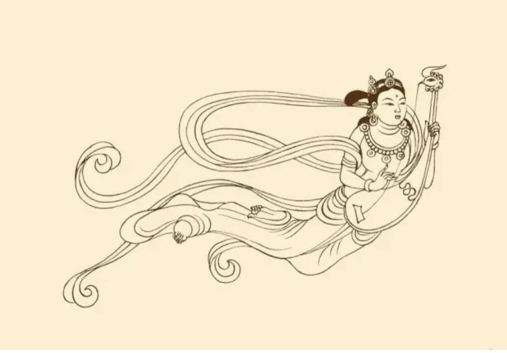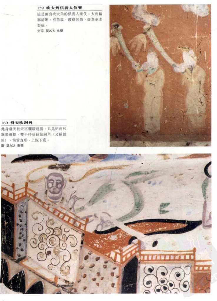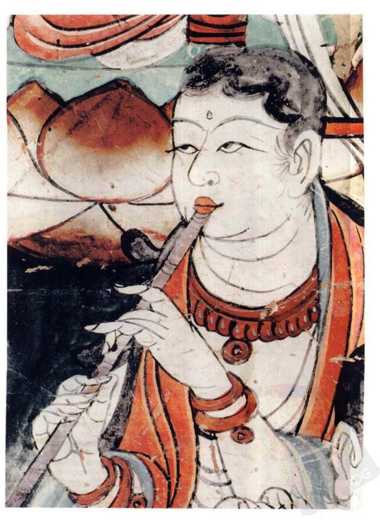 橫笛 即今之竹笛,壁畫始見於涼。最早的是八千年前骨笛,河南舞陽出土。河姆渡出五六千年前骨笛,湖北隨州市出戰國竹制律管。敦煌的多為六孔。與橫笛連類的有篪,周代已經有,有六孔但兩端封閉,全身髹漆。敦煌僅一例。