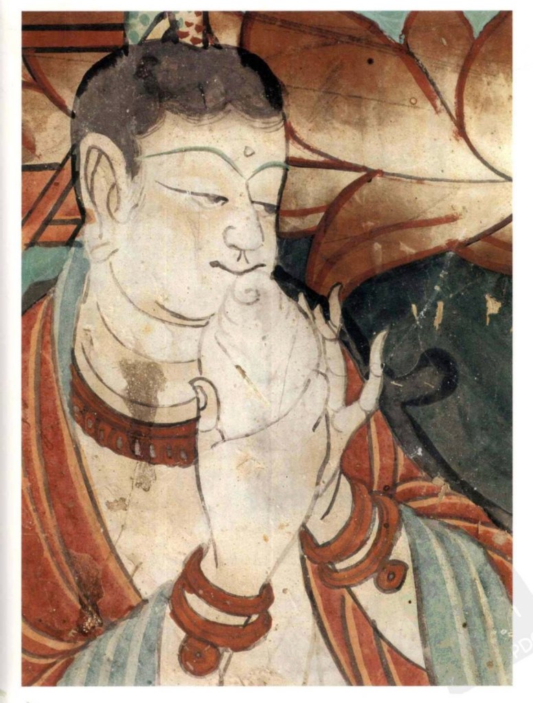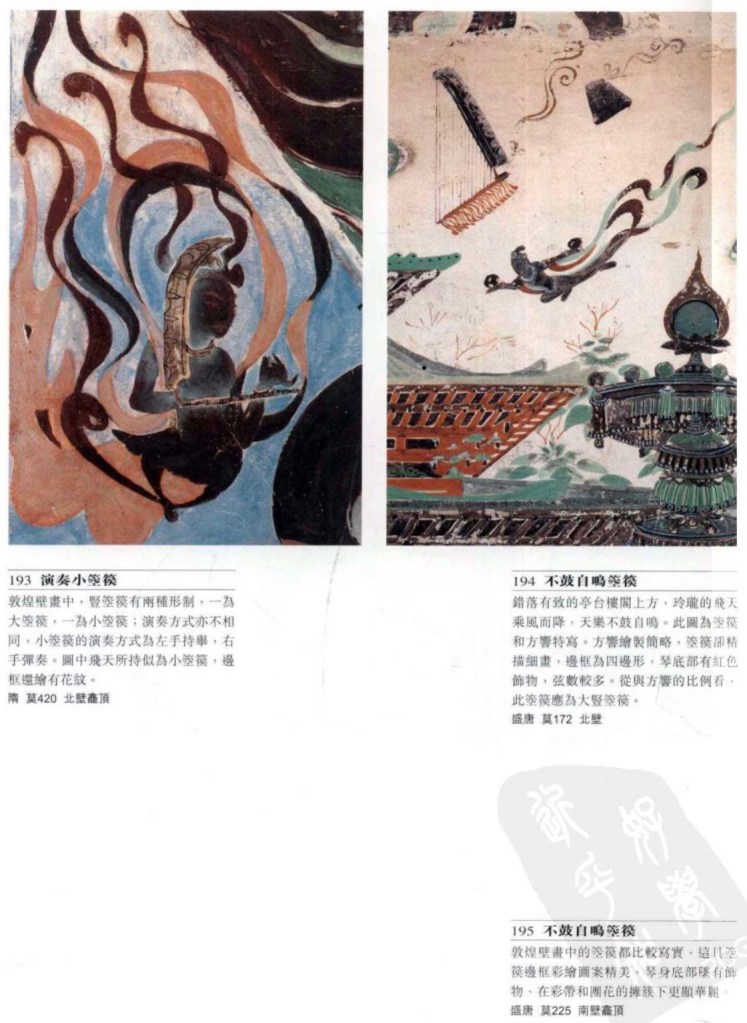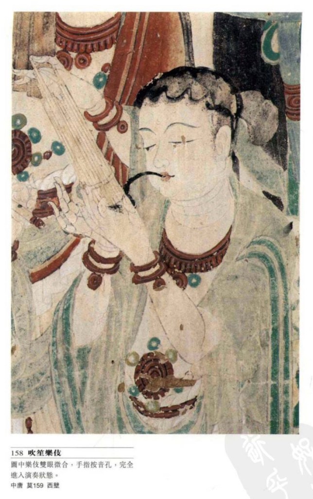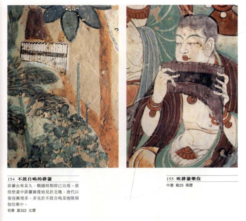 排簫 始於秦漢,文獻中也稱簫、參差、比竹、胡直等。莫高窟有三百多隻,主要有兩種形制,一為單排兩端同樣長度的竹管,一為一邊長一邊短。壁畫中的排簫始於北魏,至元。