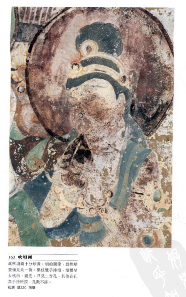 塤 始見於新石時代,陶土燒製。周代已列入八音之土部。殷代五音孔,到漢代發展為六孔。在古時曾為雅樂必用樂器,後來俗樂也用,惜未被正式列入樂隊。敦煌僅有一例。