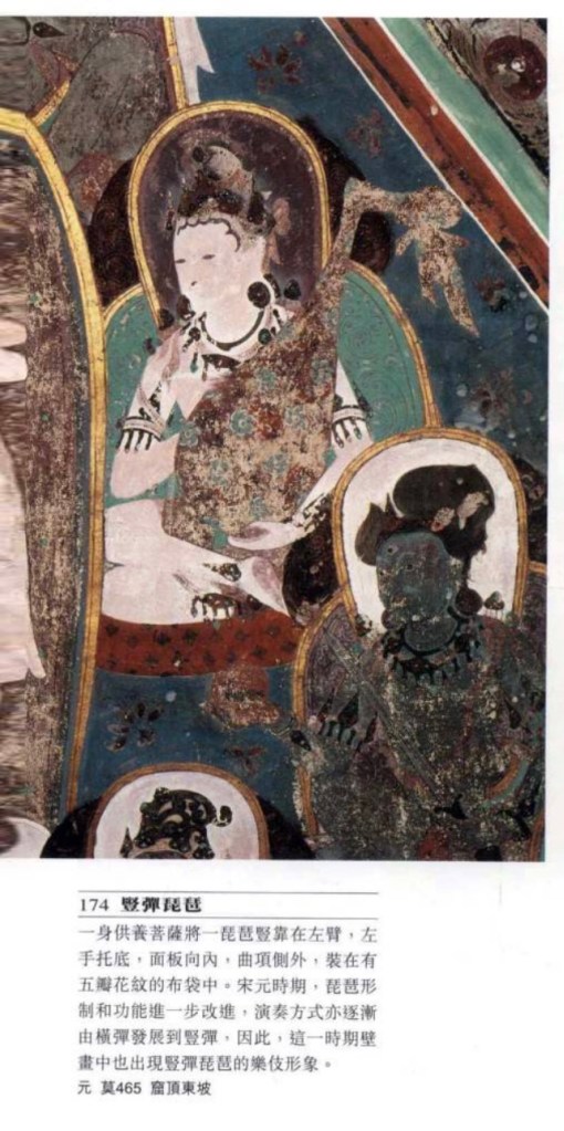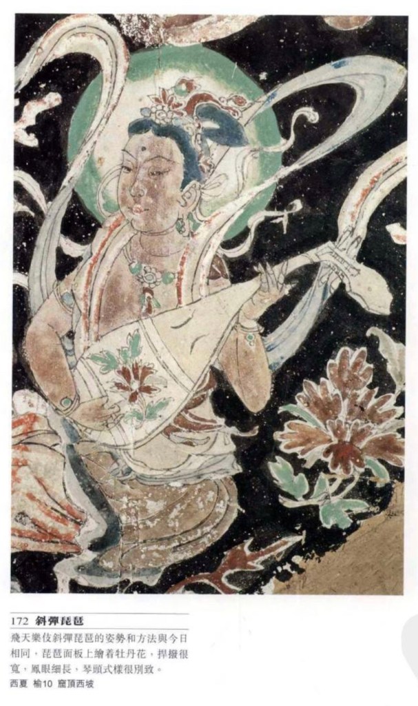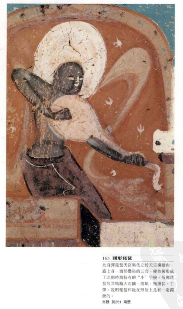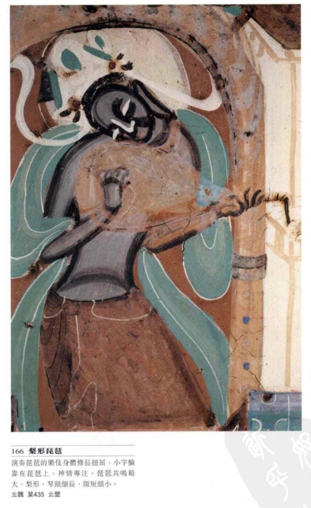 琵琶共鳴箱為梨形,四弦,曲項或直項。弦的兩端設山口及縛手。古時初設四相,後設品柱。面板裝饰有捍撥,並在面版上左右挖傳音孔,稱為鳳眼。早期橫抱,朋代以後才變為豎抱。琵琶二字始於漢代,漢代琵琶是指圓形的阮,東漢晚期出現梨形,名稱混亂。至唐。梨形定名為琵琶,圓形為阮咸。莫高窟有七百多隻,早期較小及狹長,隋代漸寛,至唐代穏定在寛圓型。 五弦 亦稱五弦琵琶,稍小,數量只見四十餘個,曲、直項也有。
