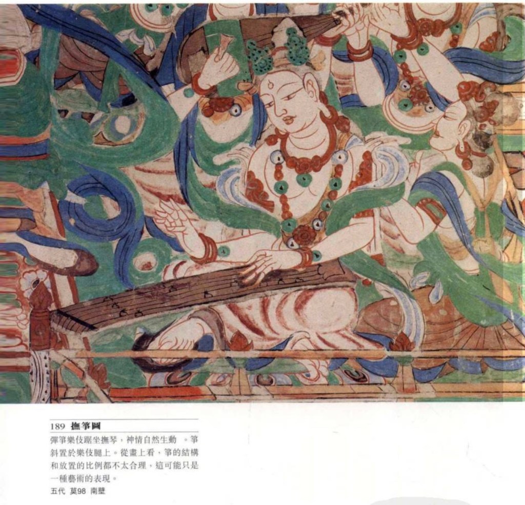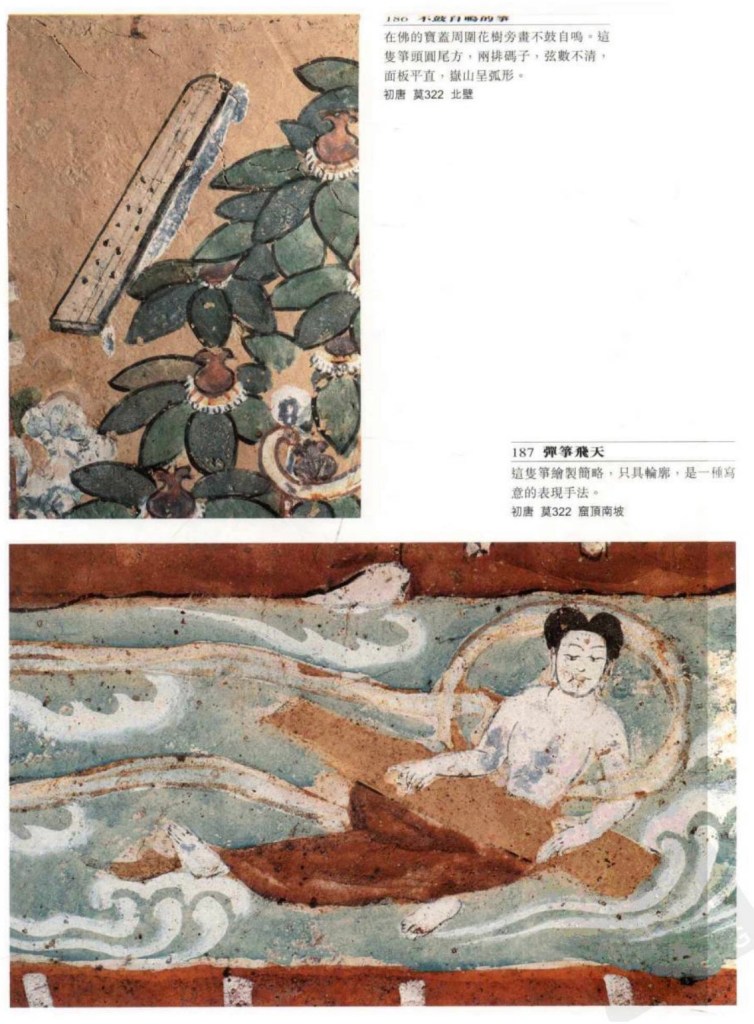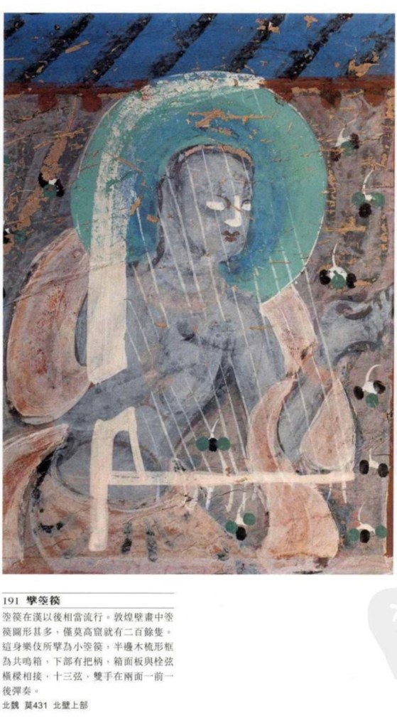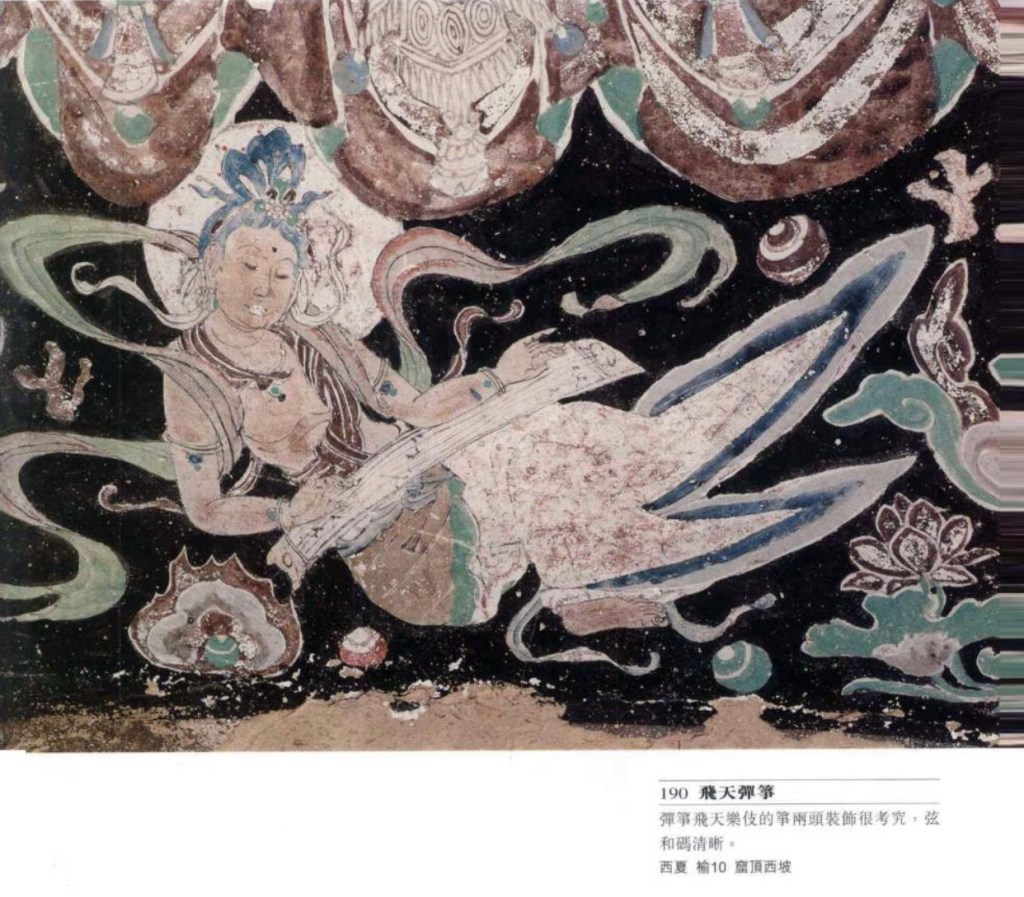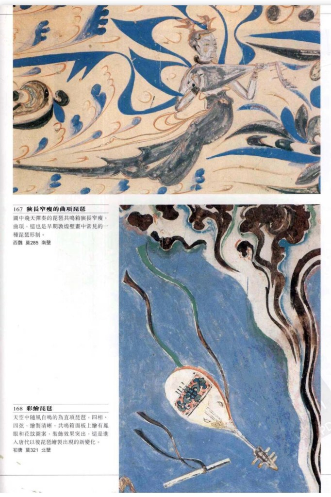 彎頸琴 敦煌特有,琵琶與箜篌之混合體。不同陳晹《樂書》中的鳳首箜筷,敦煌的雖然有些飾以鳯首但似琵琶多於箜篌,故只能以彎頸琴稱之。出嚟現於中晚唐,至元。共鳴箱全如琵琶,面板上還有鳳眼、捍撥、縛手,頭部有鳯首。頸部細長彎曲,所以無論一弦或四弦皆不能按按弦發音。