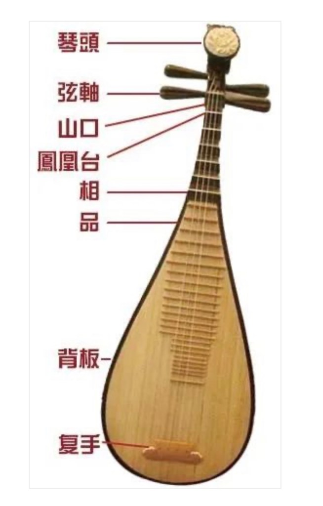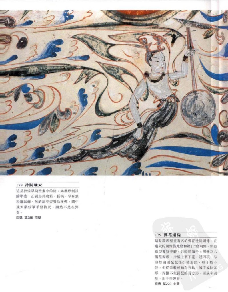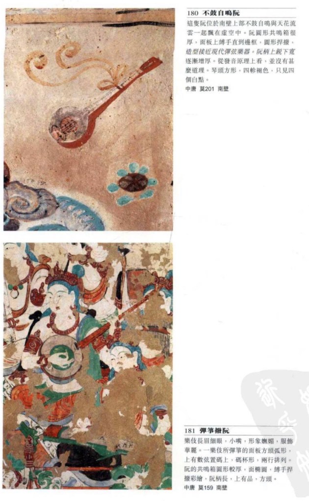 阮 又稱阮咸,因竹林七賢阮咸而名,武則天以後正式称阮。圓形共嗚箱,長柄,十二品柱,四弦(或五)。漢石刻及晉墓皆有,最初也稱琵琶,秦琵琶或漢琵琶。漢末傅玄《琵琶賊》實際是院。敦煌的始於北魏,形態不統一,後期共鳴箱面板上也有圓形捍撥及鳯眼。另有花邊院,較大,周邊呈分花瓣形。