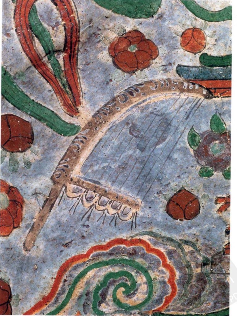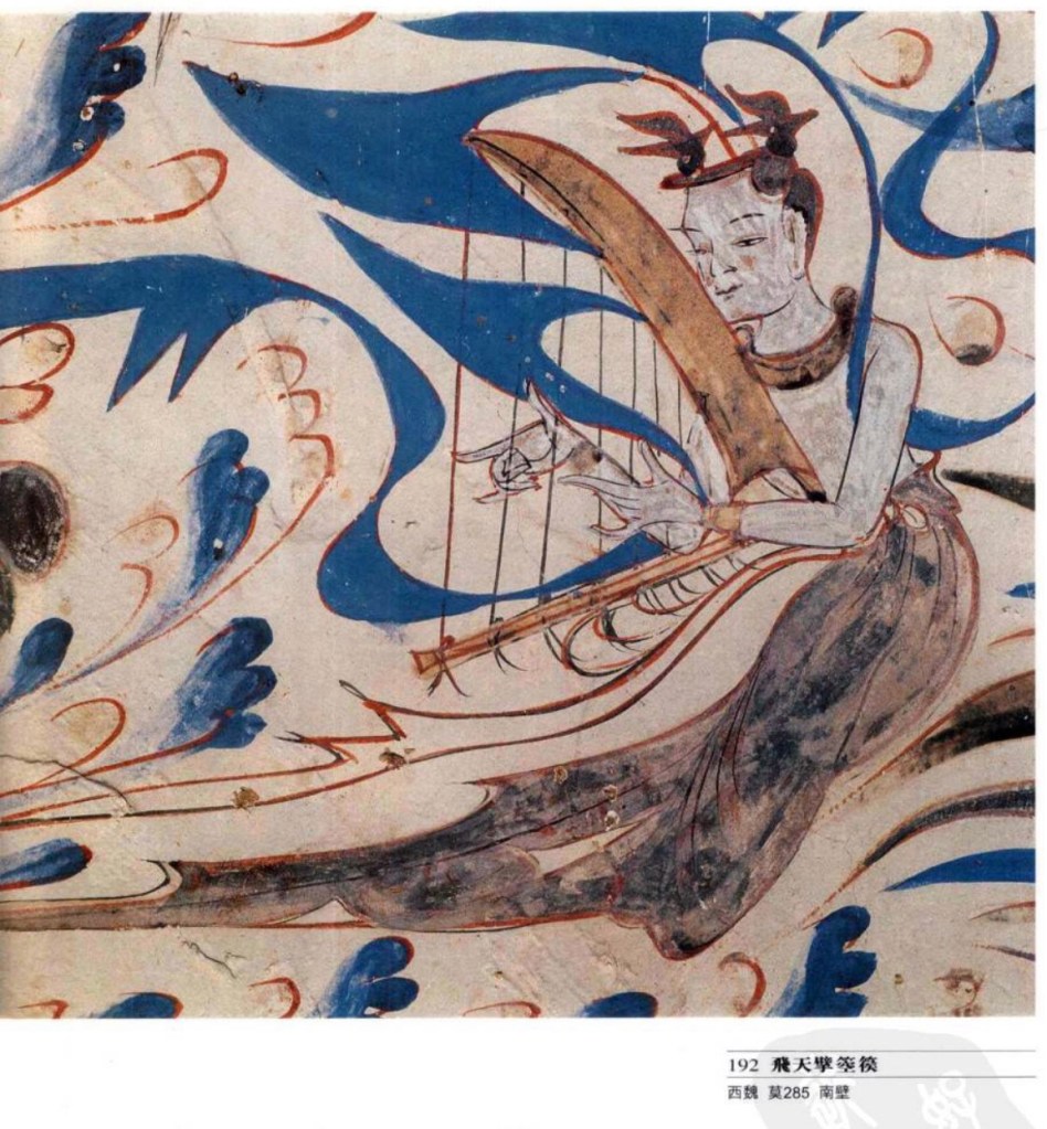 箜篌 春秋戰國時己有臥箜篌,史書只有名稱,沒有具體描述。今天只見於漢石刻及魏晉墓葬壁畫,沒有實物。豎箜篌漢以後相當流行,可能隨印度佛教文化經西域進入中原。早期的形體小,一手持,一手彈,弦數也較少。唐以後多為大型彩繪,邊框有團花、團龍、團鳳等紋樣。鳳首箜篌也是敦煌特異樂器,酷似現今緬甸的桑柯,也是唐書所記載驃國所進之箜篌。