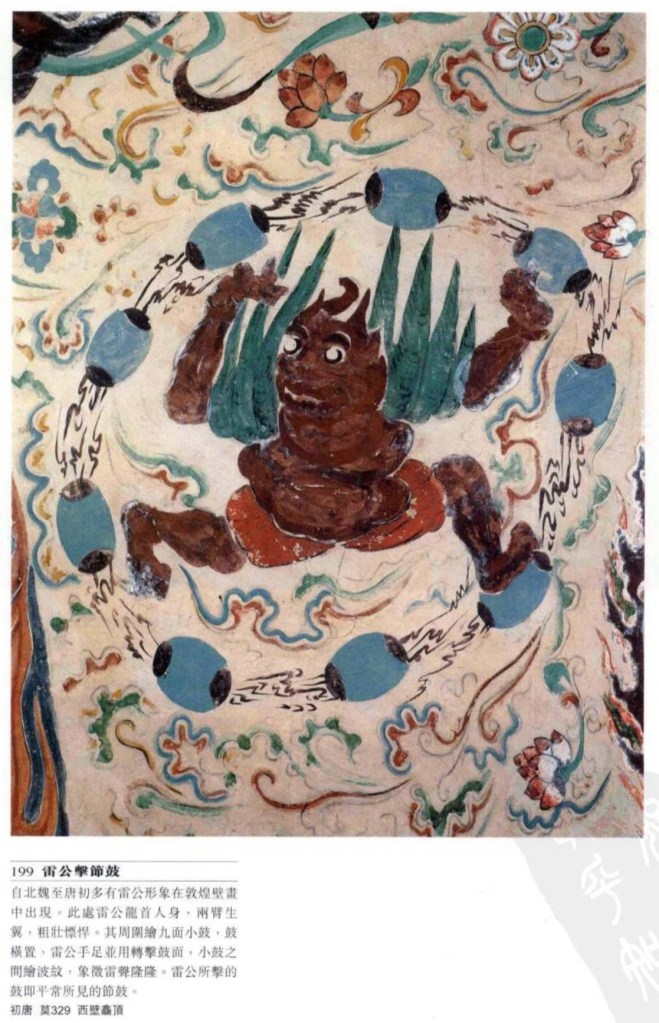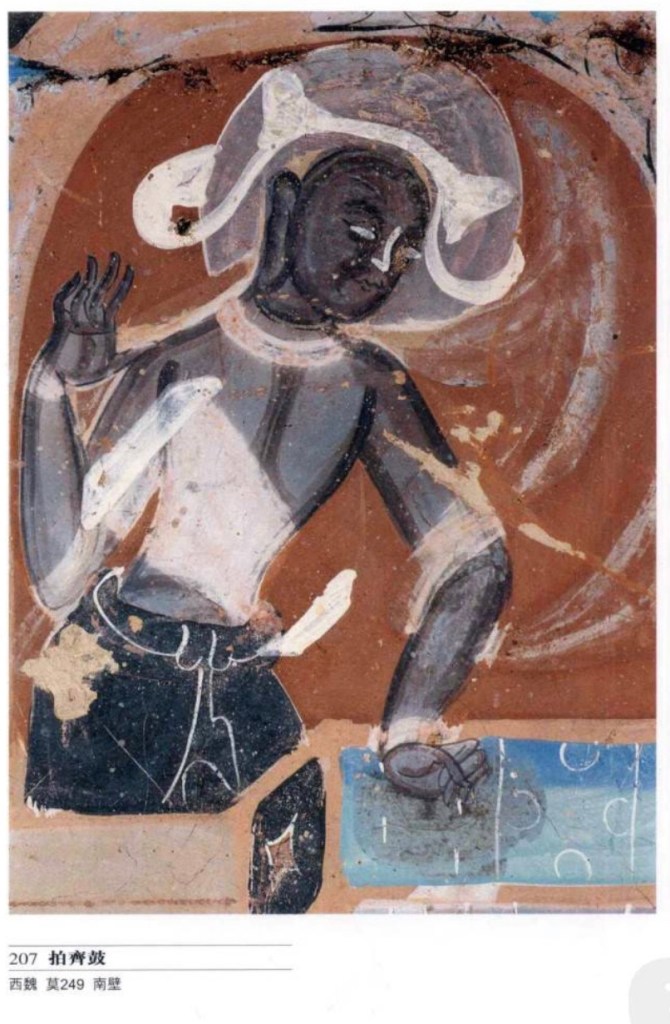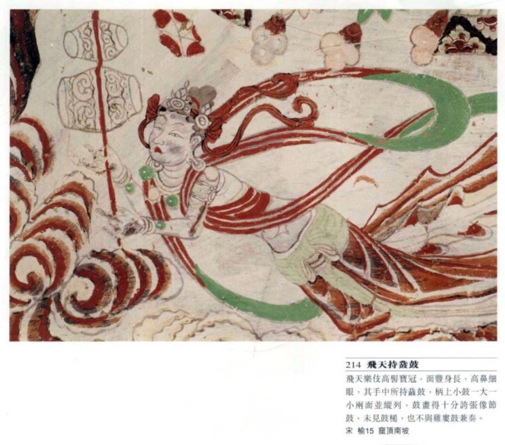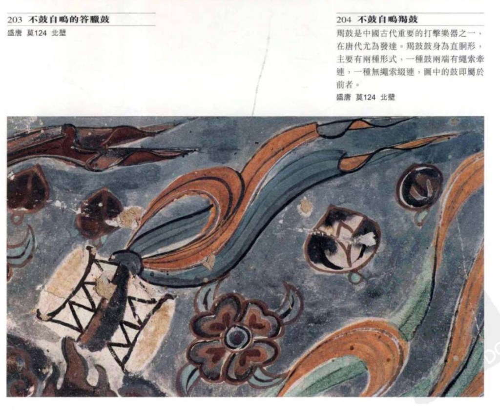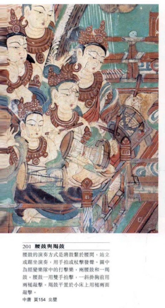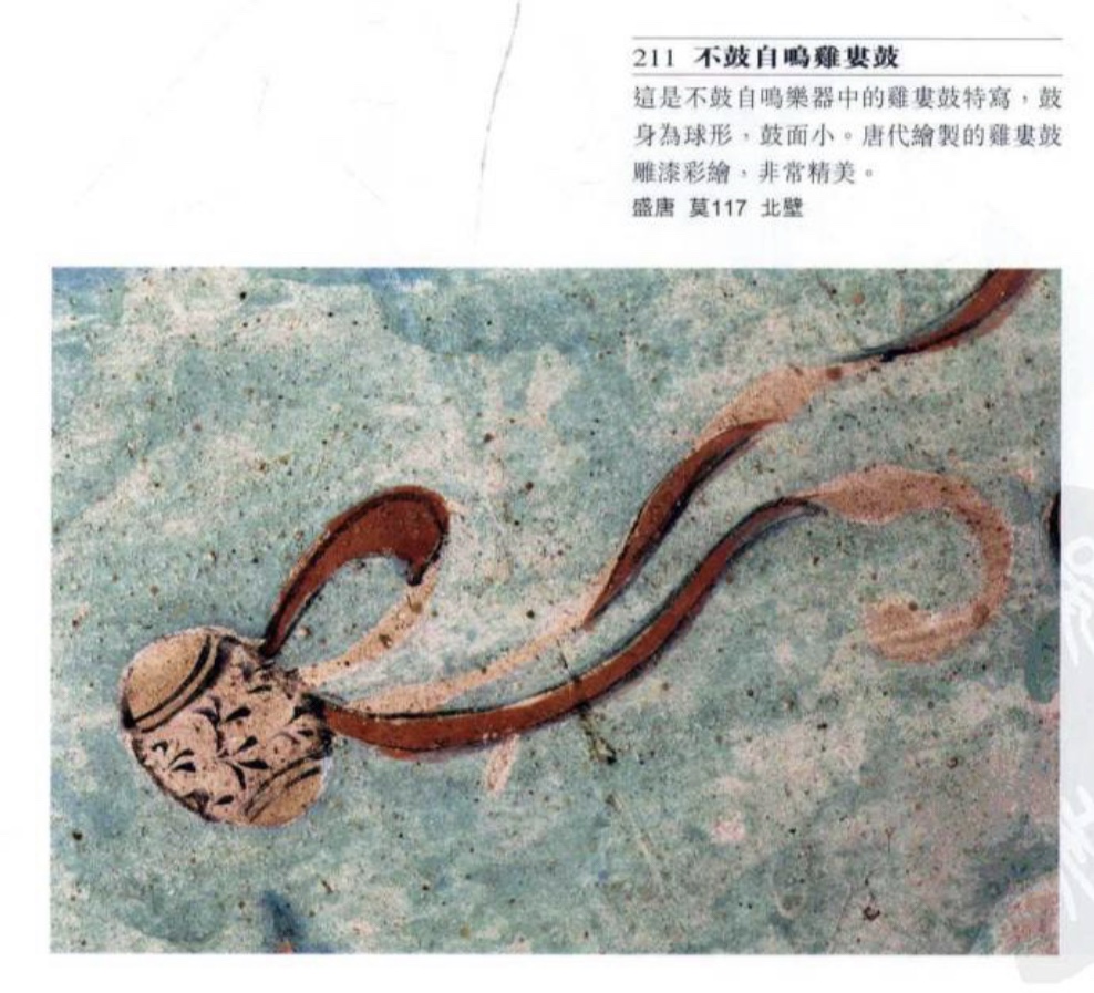 大鼓 亦稱建鼓,唐文獻稱大鼓,為佛敎廟宇起居報時的暮鼓,宮廷樂隊有此編制,但敦煌只見於勞度叉鬥聖經變畫中。