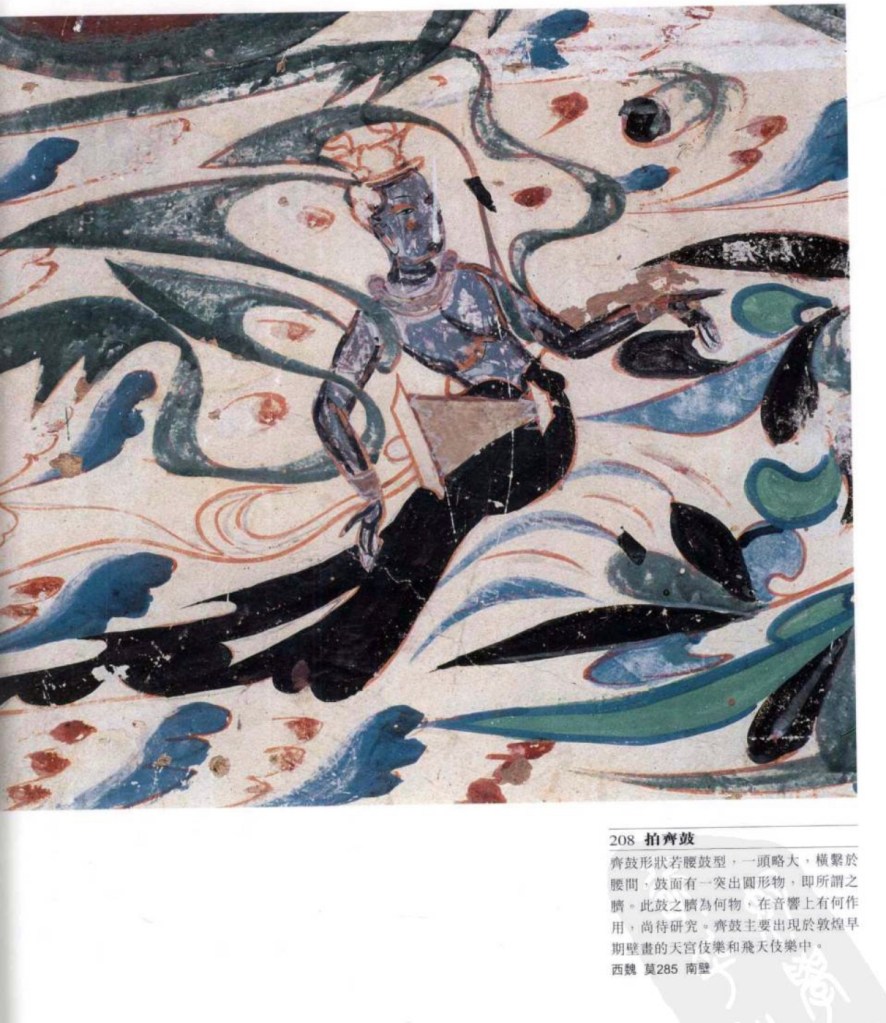 齊鼓 古代鍋形膜鳴樂器,《古今樂錄》描述為:齋鼓如漆桶大,一頭設齊於鼓面如麝臍,故曰齊鼓。敦煌的形狀若腰鼓,一頭略大,鼓面有一突出圓形物,即所謂臍,不知何用。