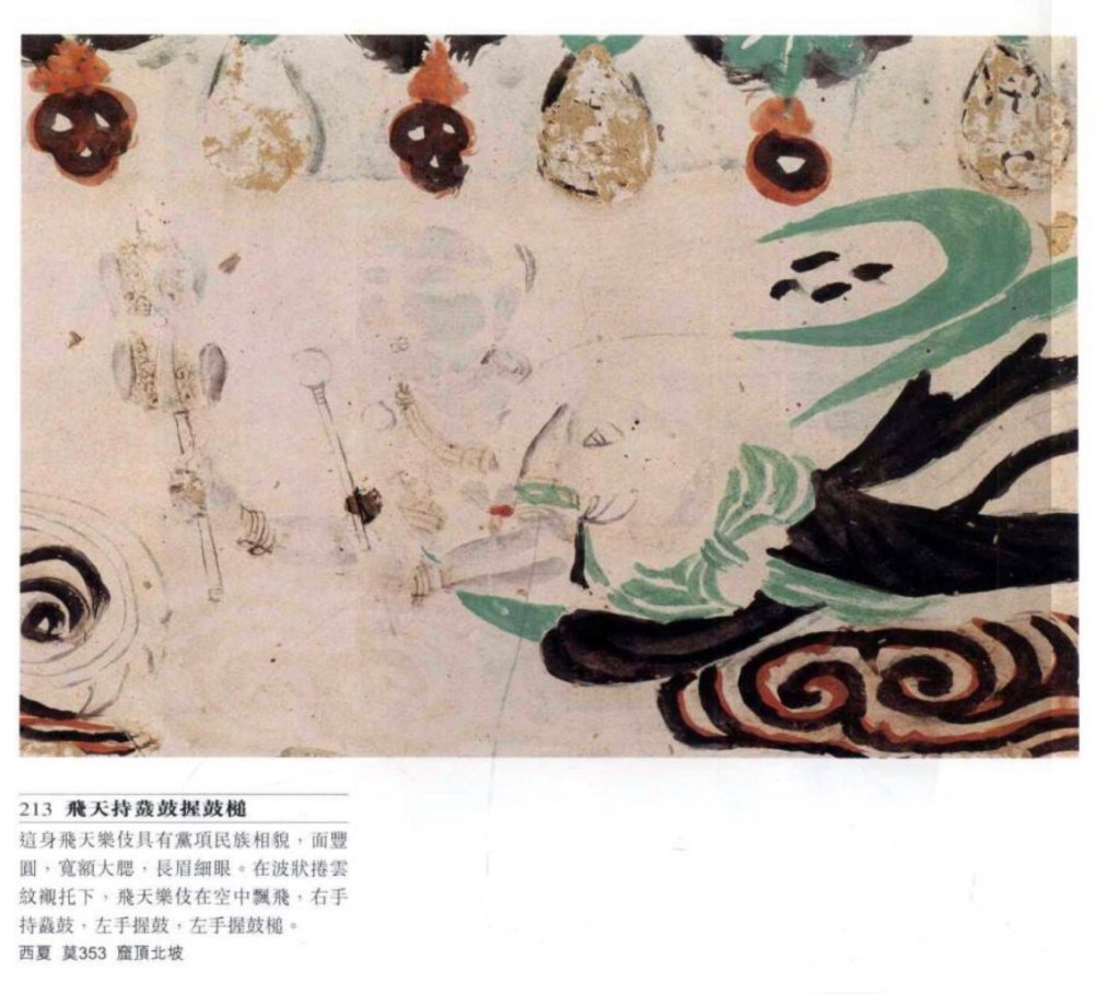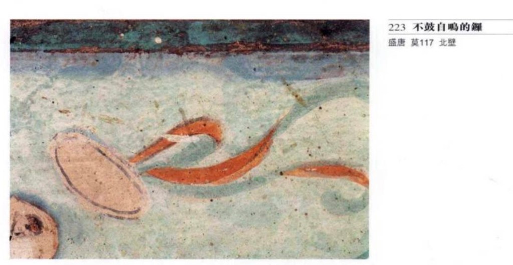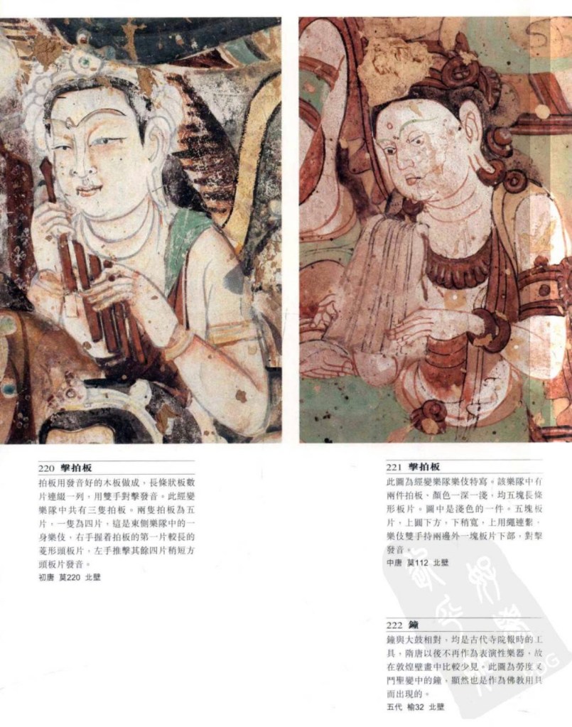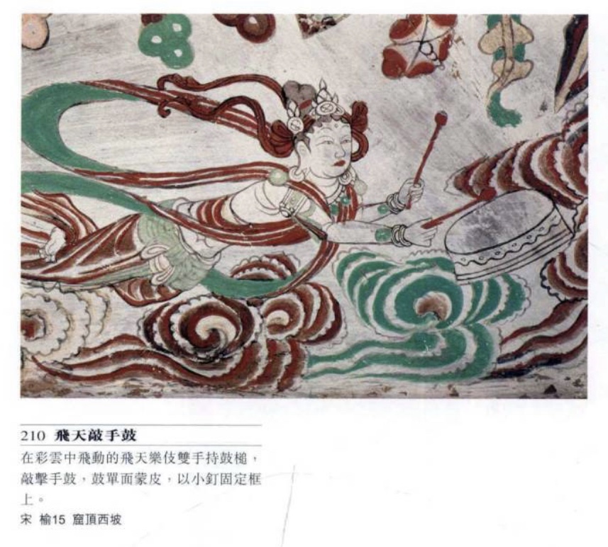 鑼 古時也稱鉦,以手擊或小槌擊。莫220窟有兩個樂伎演奏銅鑼,擊響後拋上空中。