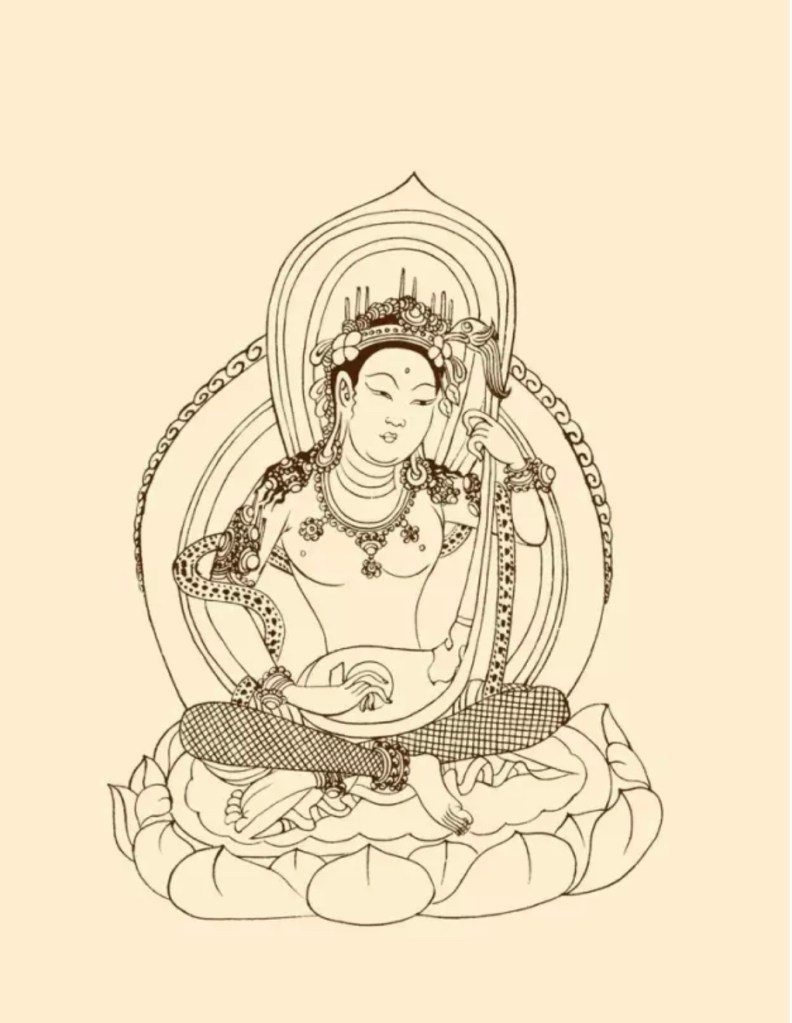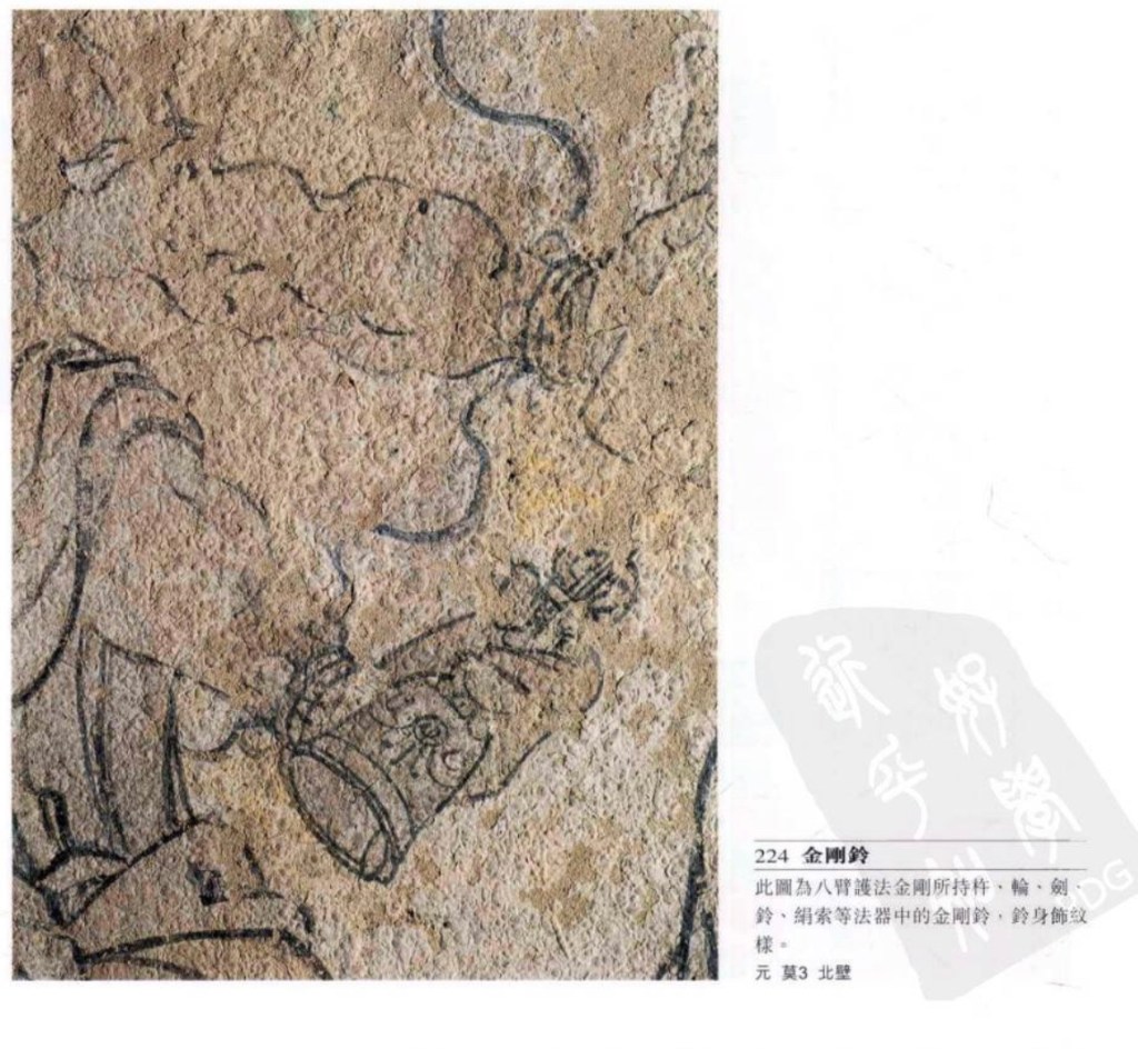 金鋼鈴 佛教傳統法器,為有柄的小鐘,中間有舌,手搖發音。中印皆沿用之今。壁畫早期未見,中晚期甚多。