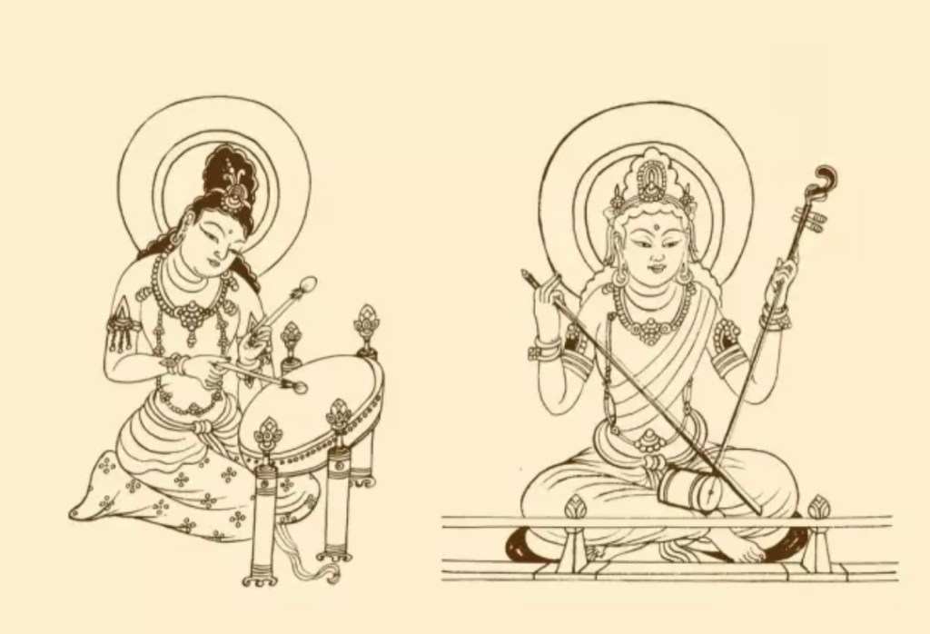拉弦樂器,胡琴 示稱奚琴,最早見於唐代,宋以後始流行。莫高窟未見胡琴,僅榆林第3窟(西息)及第10窟(元代)共繪有四支。