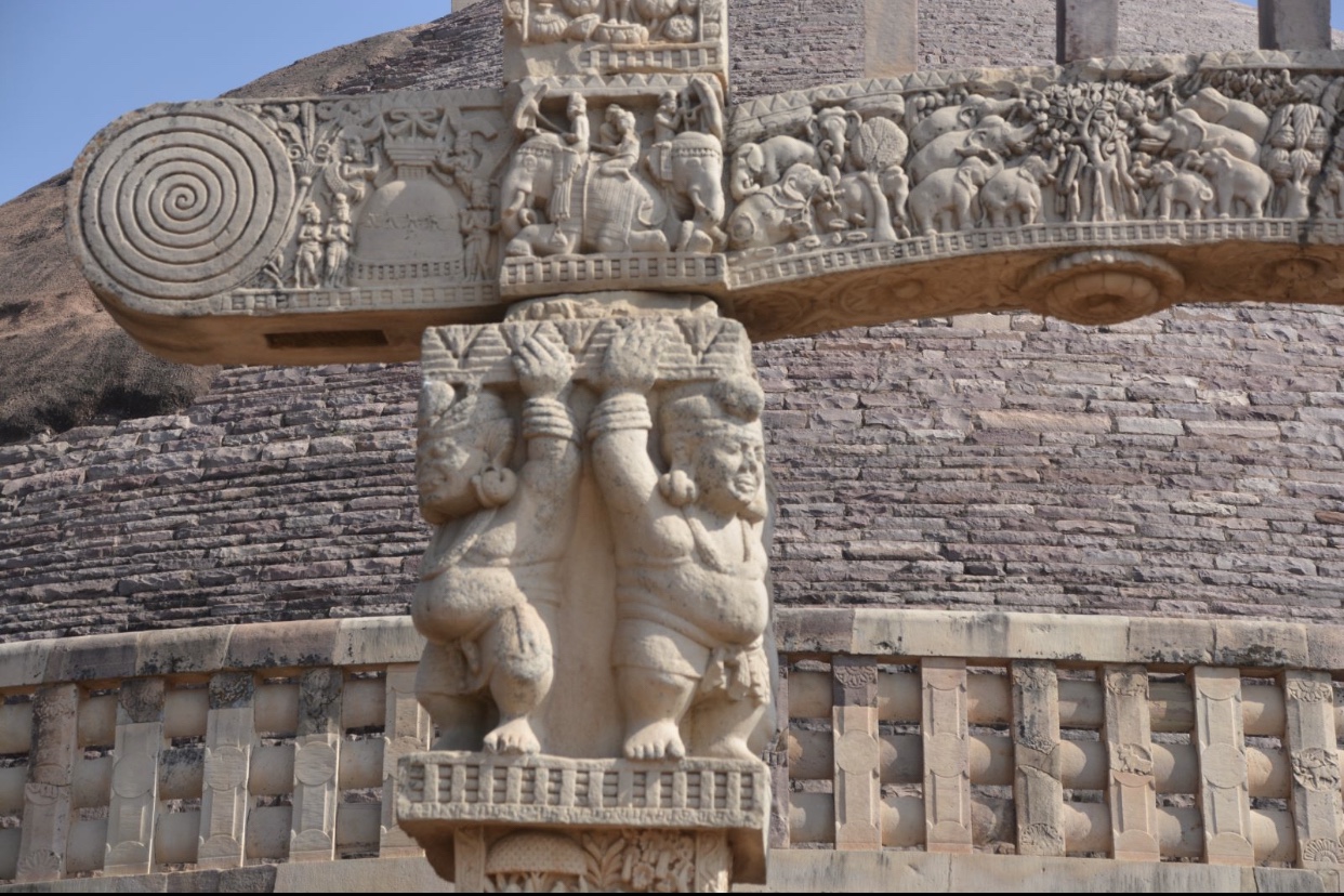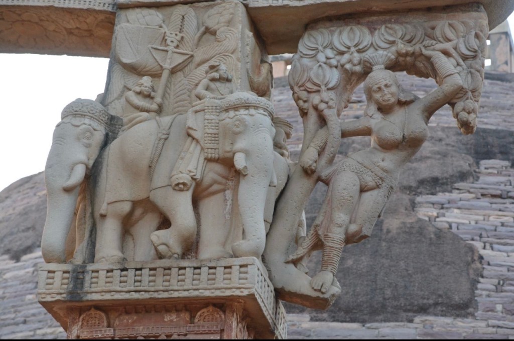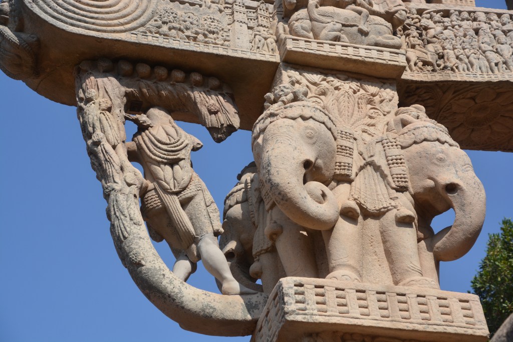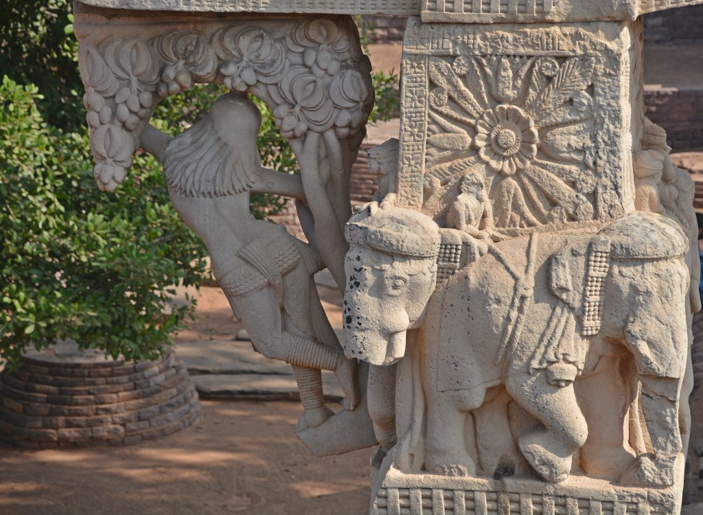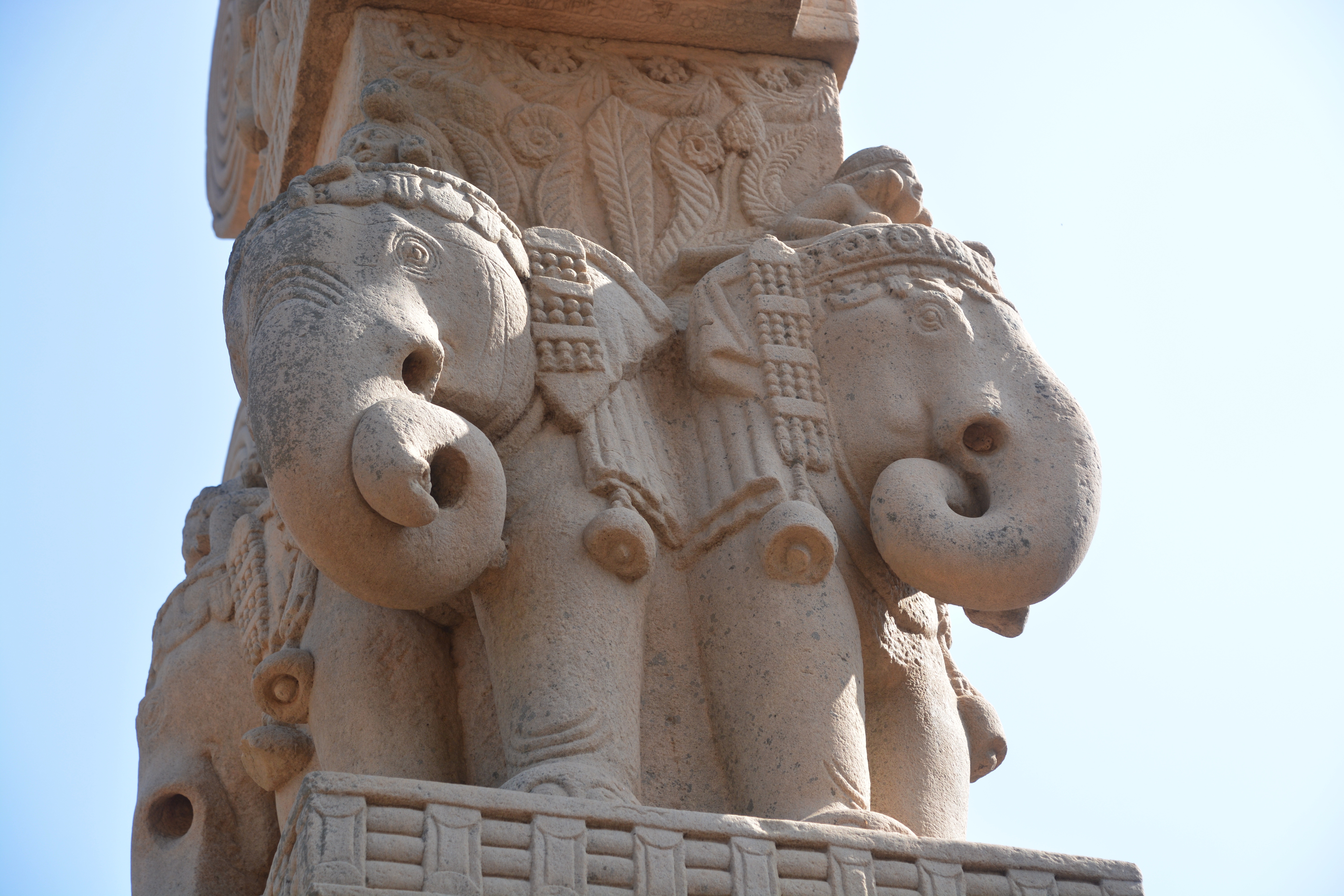 四大象柱頭 東門兩側柱頂上有溫順大象,形成一個圓形浮雕。象身上乘坐用具由一個華美的嚼子和一塊有穗子的鞍布組成。嚼子:由象耳前懸掛兩串飾物,在耳後懸掛兩個鈴鐺。這個鞍布用通過象腹的繩子在背上打结來固定。這個顯赫人物坐鞍部,手握彎鈎,親自駕馭。後面蹲伏一旗手,抓著大象腰部的結。