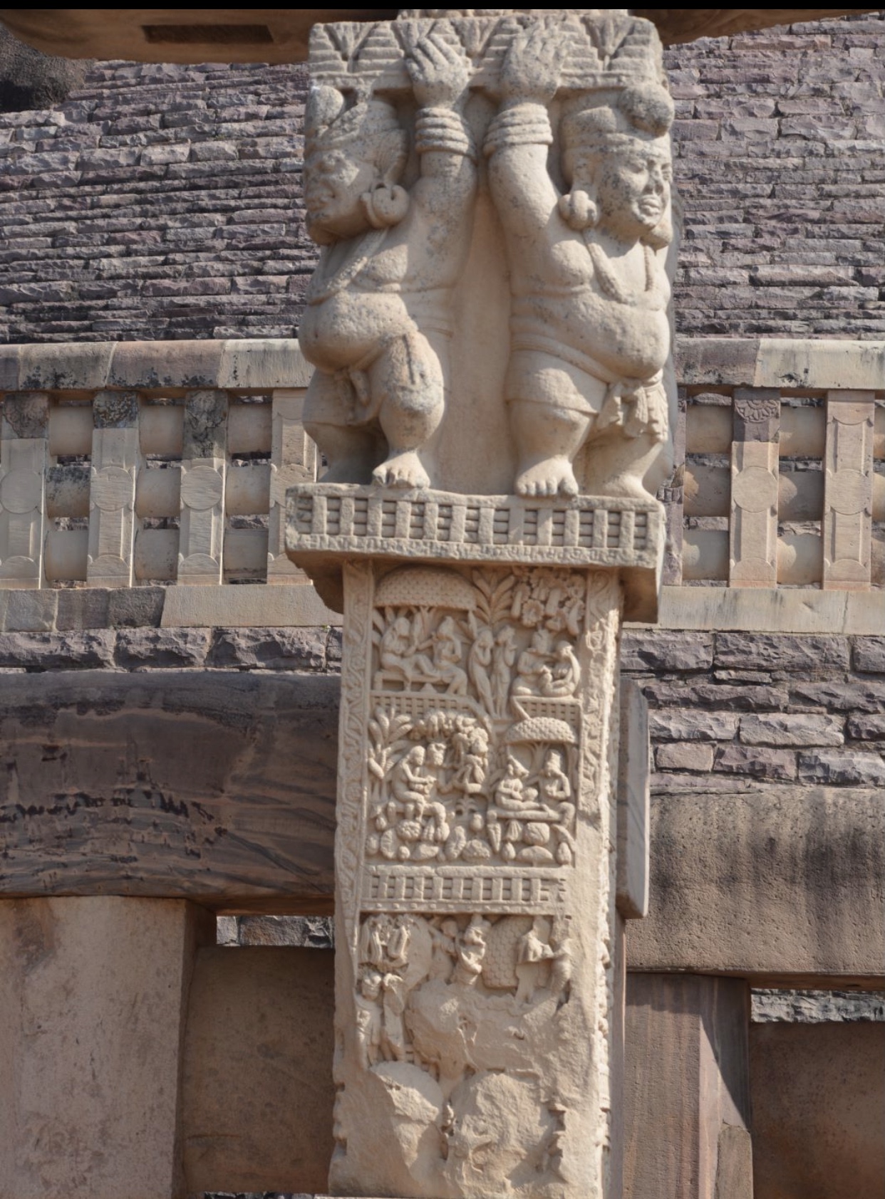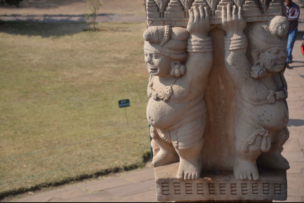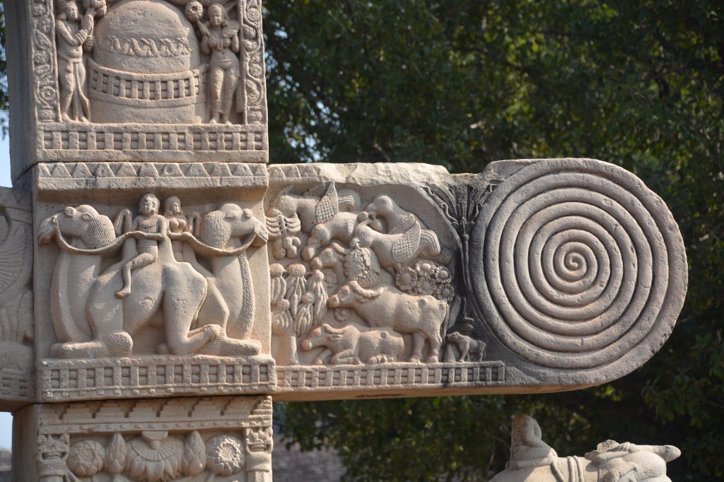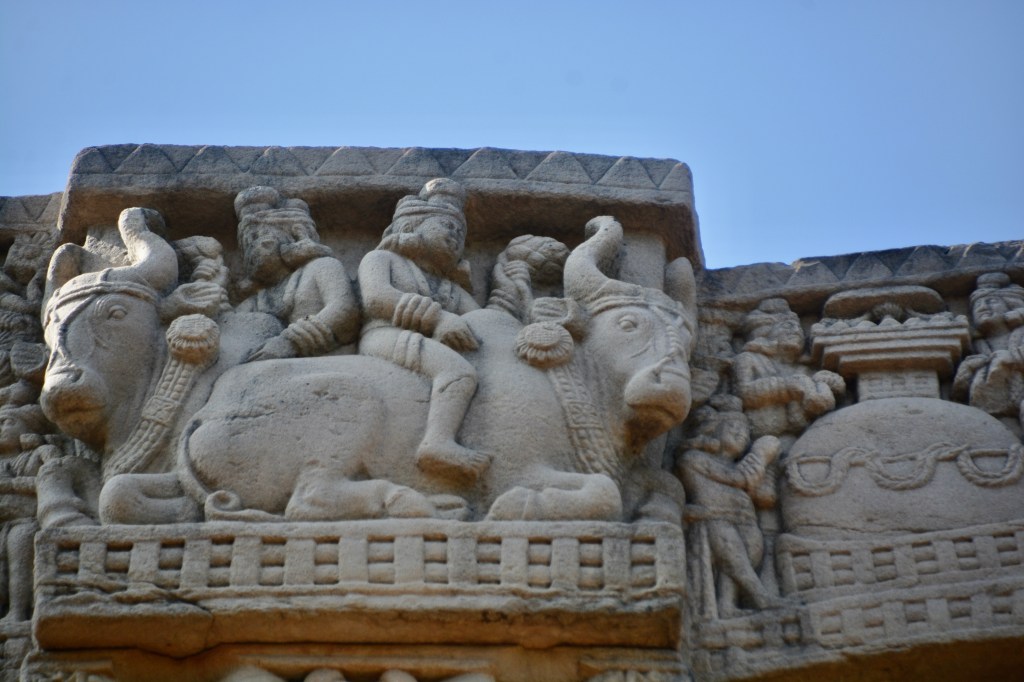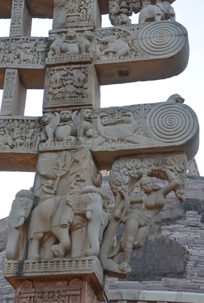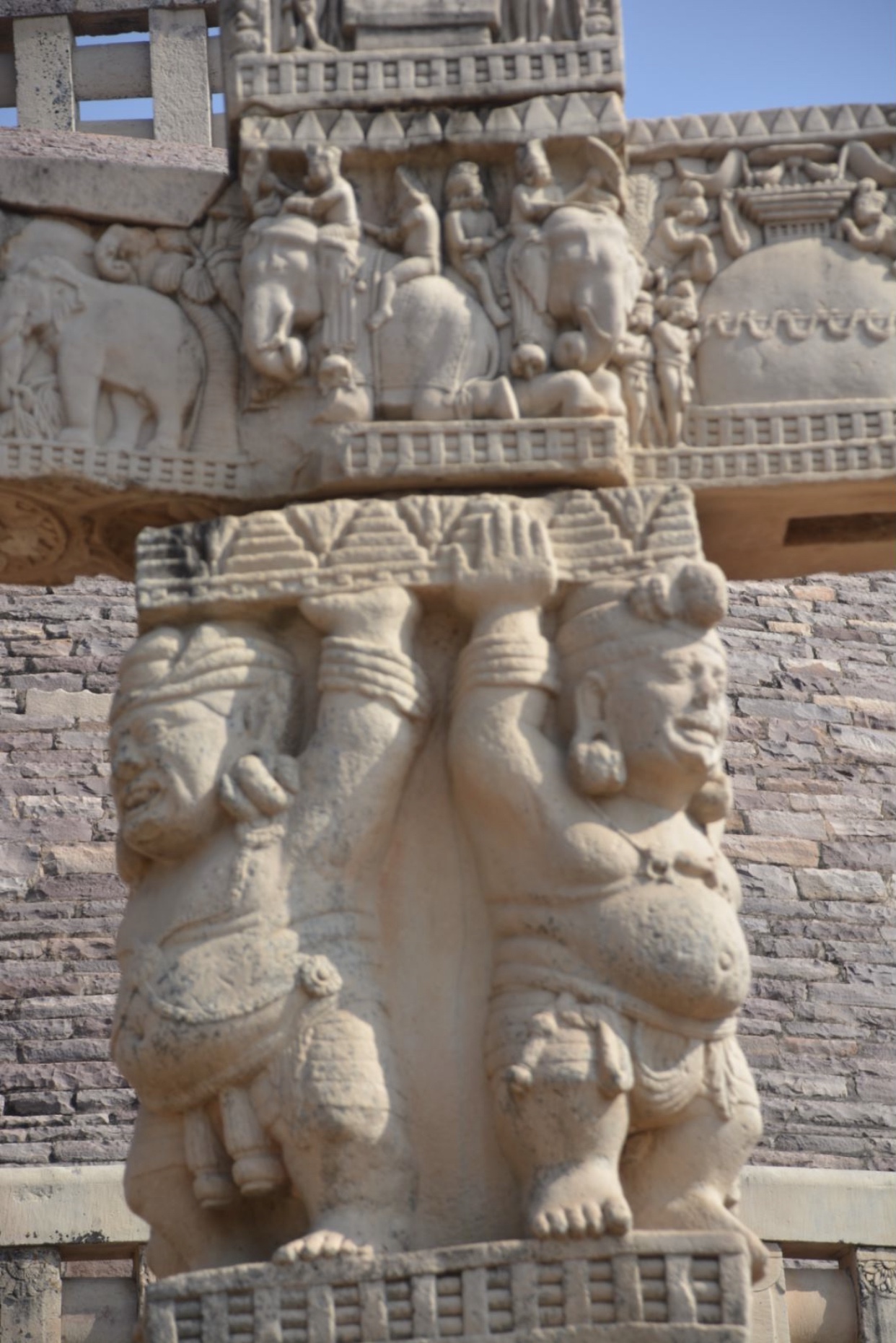 四大象柱頭 東門兩側柱頂上有溫順大象,形成一個圓形浮雕。象身上乘坐用具由一個華美的嚼子和一塊有穗子的鞍布組成。嚼子:由象耳前懸掛兩串飾物,在耳後懸掛兩個鈴鐺。這個鞍布用通過象腹的繩子在背上打结來固定。這個顯赫人物坐鞍部,手握彎鈎,親自駕馭。後面蹲伏一旗手,抓著大象腰部的結。