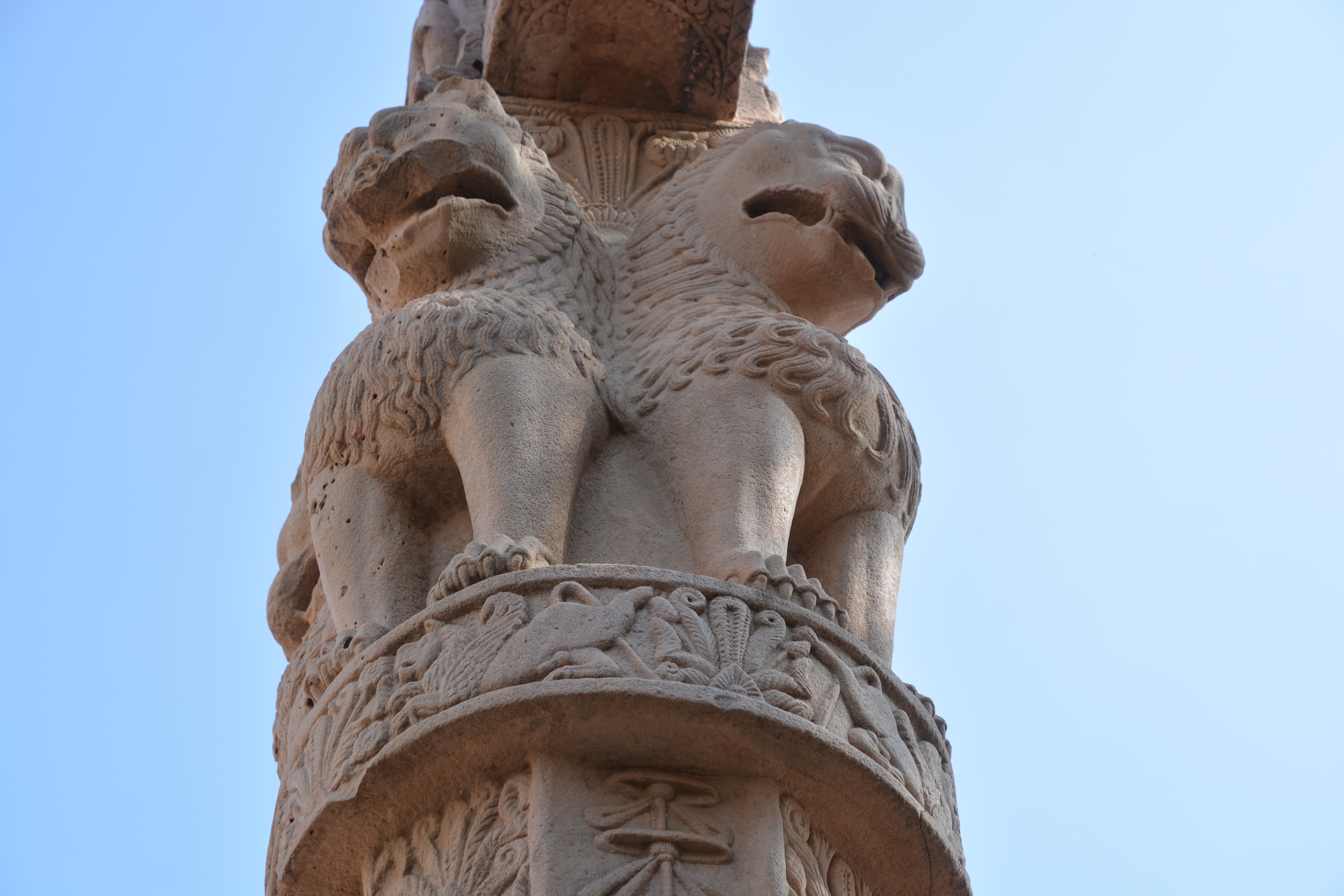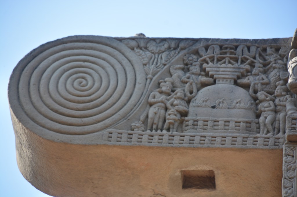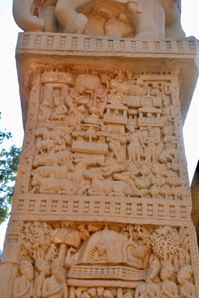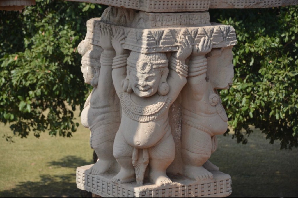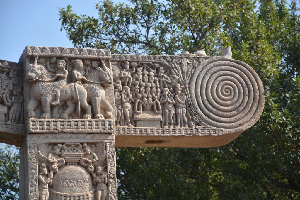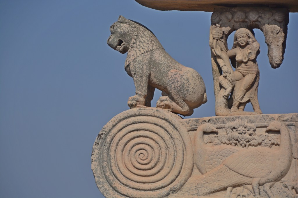 四大象柱頭 東門兩側柱頂上有溫順大象,形成一個圓形浮雕。象身上乘坐用具由一個華美的嚼子和一塊有穗子的鞍布組成。嚼子:由象耳前懸掛兩串飾物,在耳後懸掛兩個鈴鐺。這個鞍布用通過象腹的繩子在背上打结來固定。這個顯赫人物坐鞍部,手握彎鈎,親自駕馭。後面蹲伏一旗手,抓著大象腰部的結。