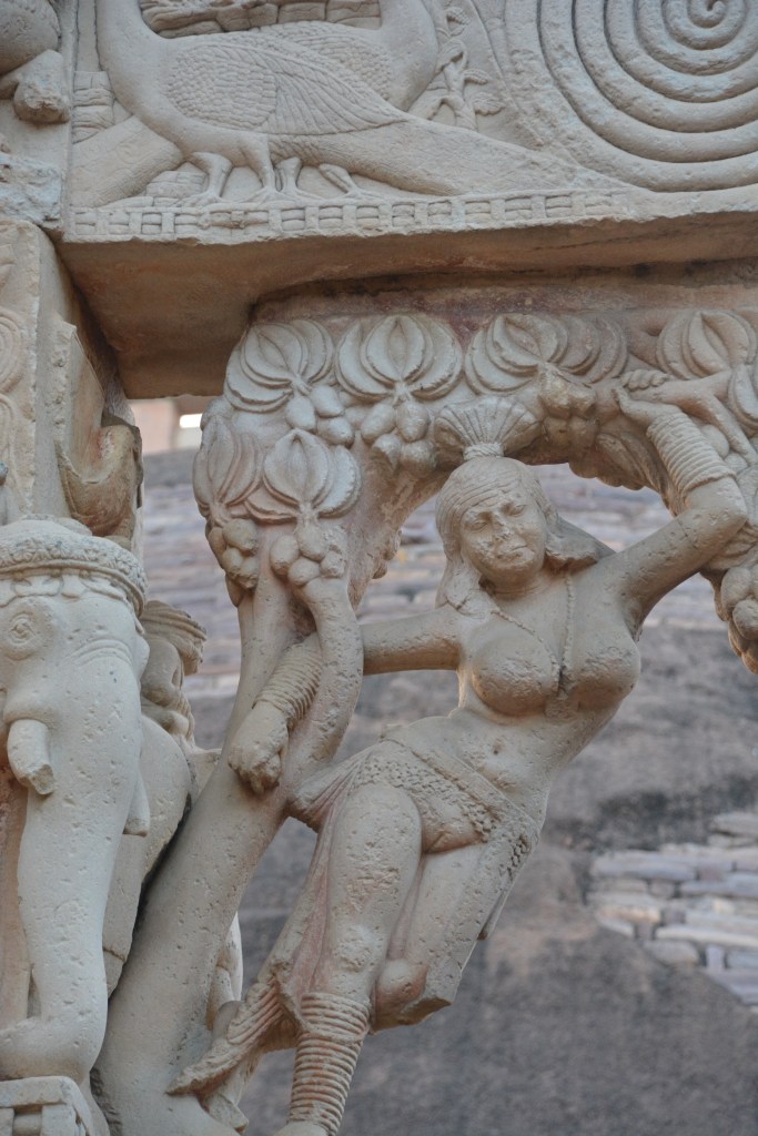 藥义女 東門北側立柱和第三道橫梁末端交角處的樹神藥义女,被公認為桑奇乃至整個印度雕刻中最美的的女性雕像之一。雙臂攀着芒果樹,縱身向外傾斜,好像凌空飄蕩,活潑可愛。全身構成三折曲綫:由頭至胸,上身傾斜向左,左手高托芒果樹枝,右手遠伸攀扶樹幹;腰部強烈向右扭轉,夭嬈而性感;臀以下垂直向下,左腳自然抬起,彎向大樹,充分表現了天真頑皮的少女性格。她是芒果樹的精靈,生殖力的化身,身體豐滿而圓潤,女姓特徵誇張。這種曲綫形式後來成為印度標準女性人體美的規範,稱為「三屈式」。