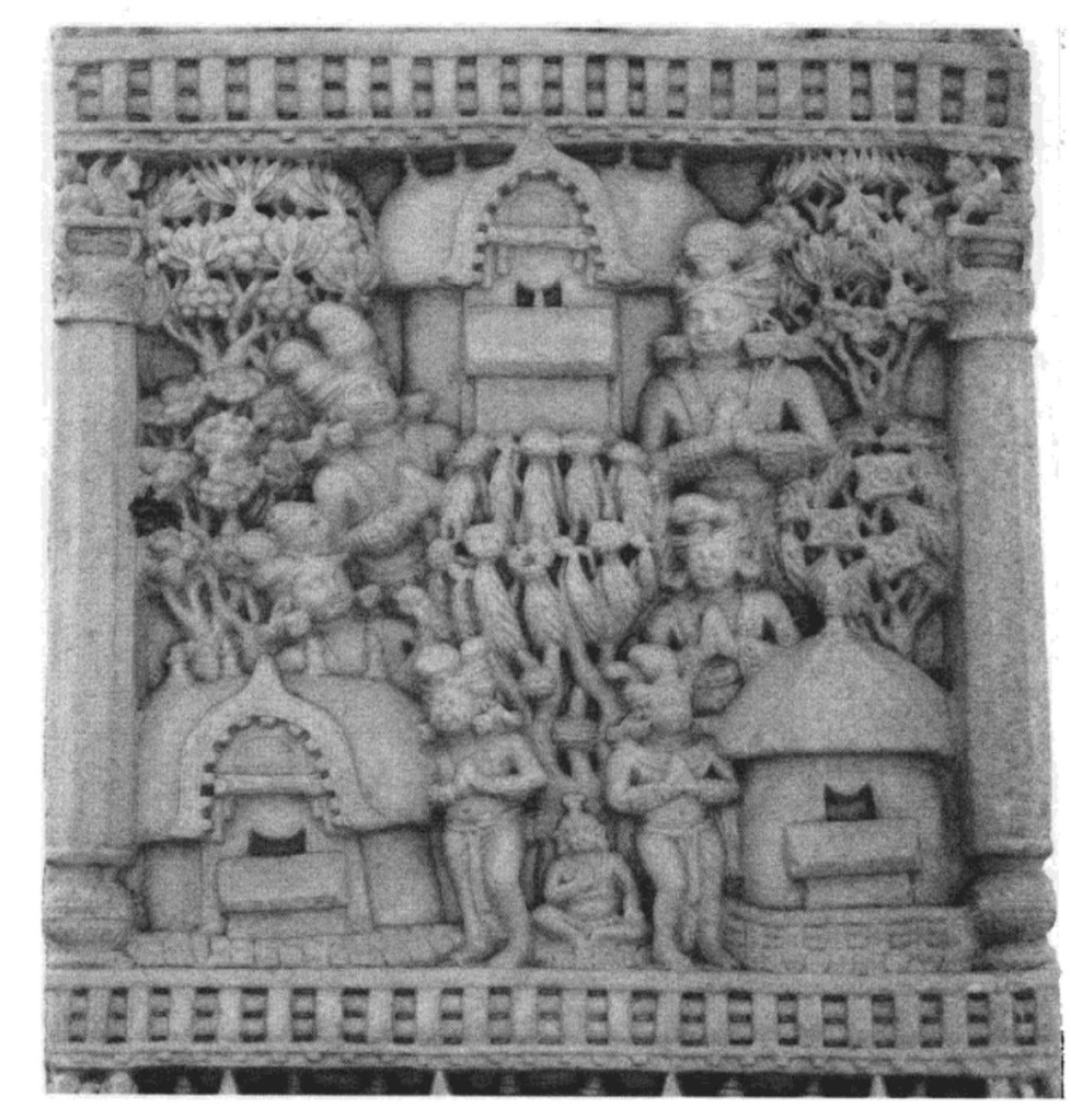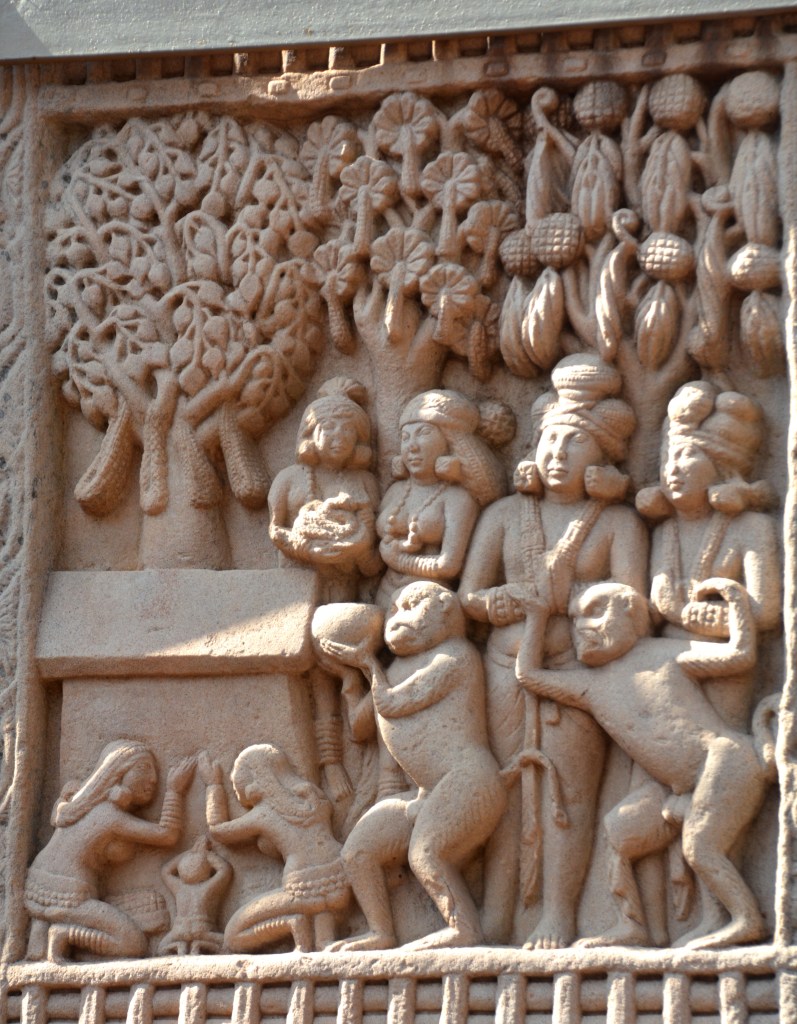 獼猴獻蜜 北門右柱內側第二格 以掛着花環的菩提樹及金刚座代表佛陀,座前有獼猴捧佛鉢供獻,後方的則手舞足蹈,可能是同一𤠣子的表現。