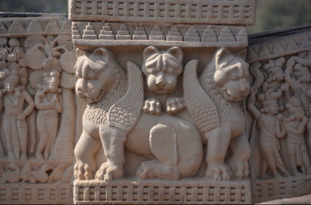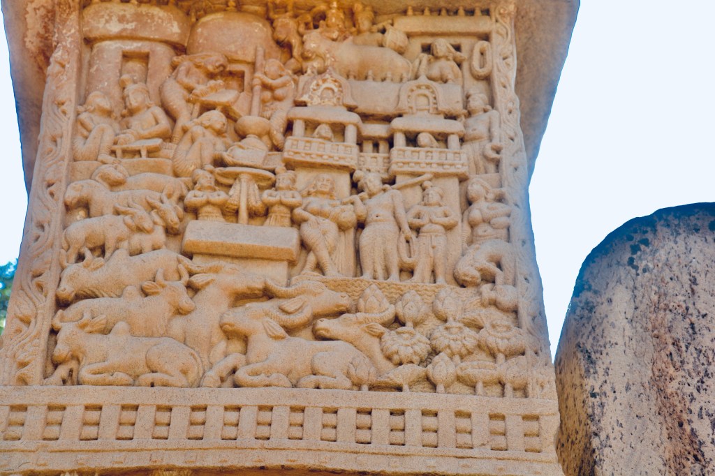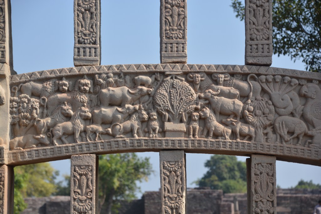 林間修行圖 東門背面中橫梁正常中 空座象徵佛陀左叢聚林修行的情形,四狮子守護寶座,還有水牛、鹿、及鳥。右邊是人面公牛和一個大金翅鳥,旁邊有一毒蛇及藏獒。