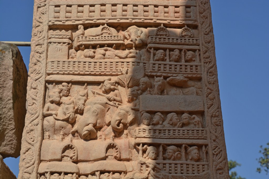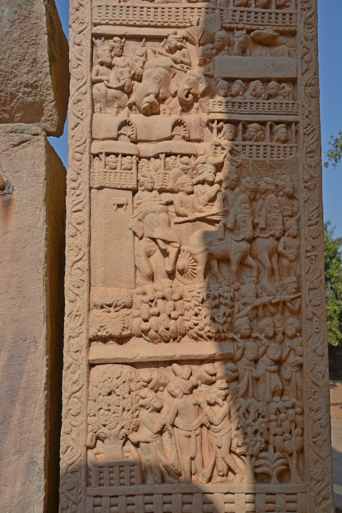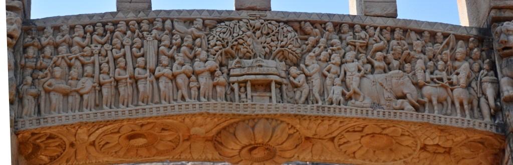 太子出家 東門正中橫梁。故事從左側起,咆哮大象正穿越擁擠的街道準備出城。婦女在护城河汲水。一各男子背對方向囘頭遙望家園,可能是悉達多的僕人車匿,此乃神來之筆,將眾人在離開時思念家鄉之情表露無遺。城門右方見駿馬在天神捧住持下,四腳騰空地出了城門。馬前有兩僕人,分拿拖鞋及提水壷。上方是天神,揮舞衣巾、捧花環、敲鑼打鼓、執傘蓋及塵拂。 悉達受出嚟城後,一夜之間穿越三個國家。來到阿奴摩後下馬,將全身瓔珞脫下交給車匿。有法輪的佛足印象徵成佛,車匿頂禮告別。在佛足印下方,馬反方向離去,沒有傘蓋及塵拂,只有三天人在背後推著不願離去的犍陟,車匿在最前方,背著太子瓔珞之包袱,不捨地囘頭張望。