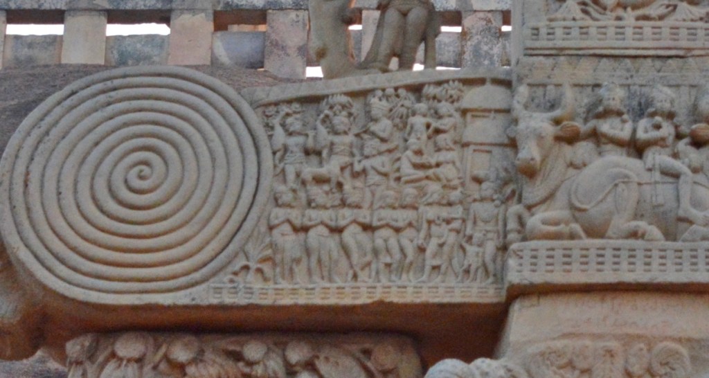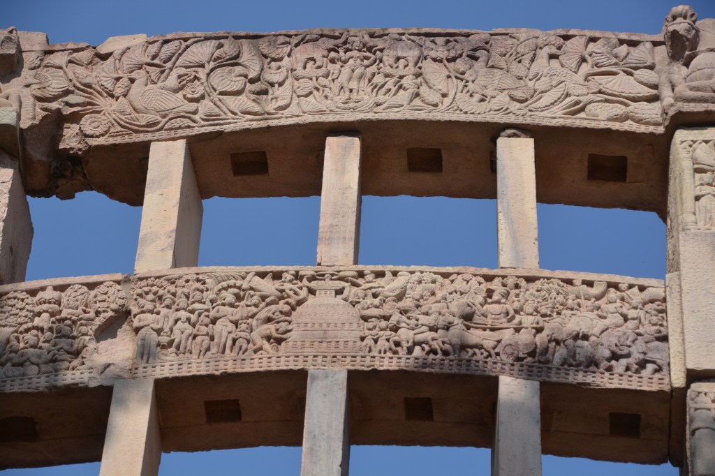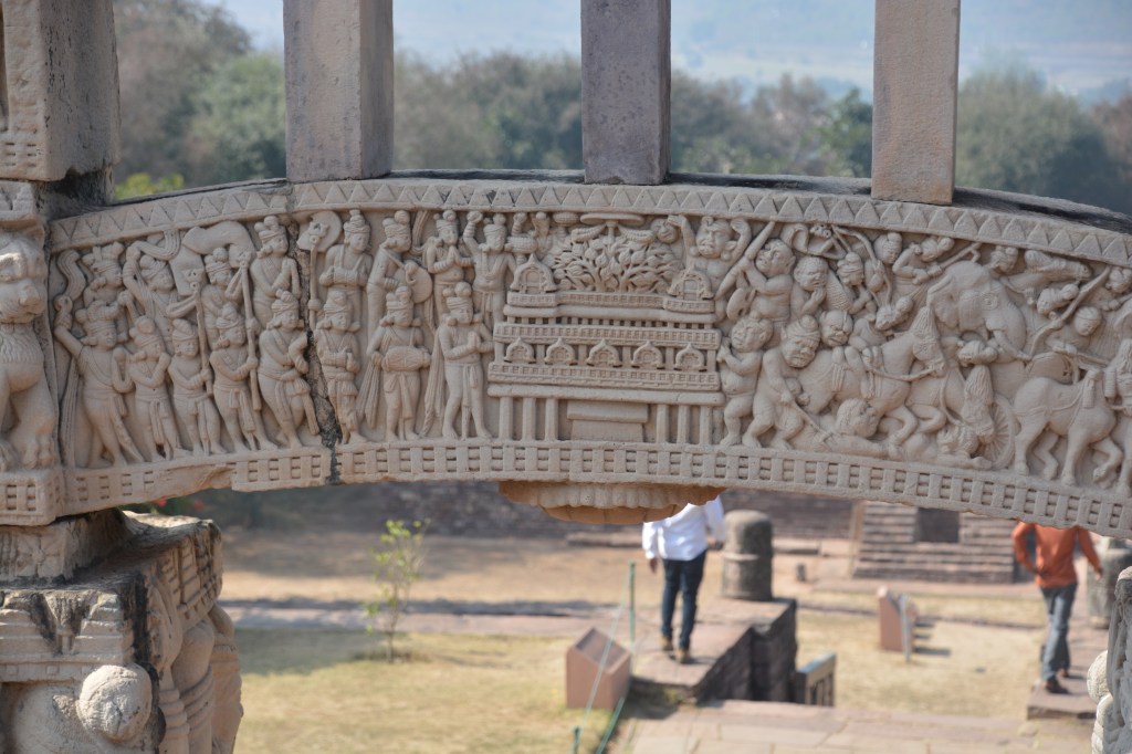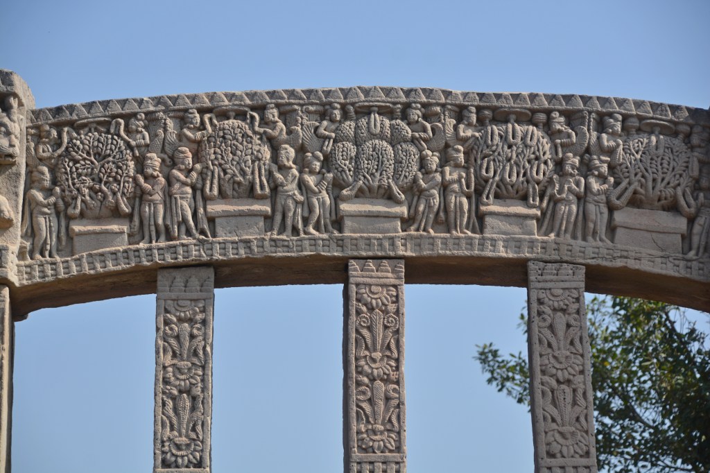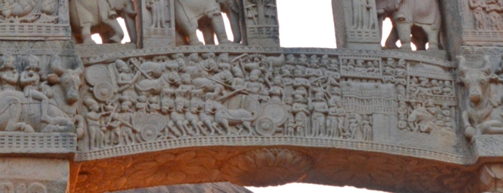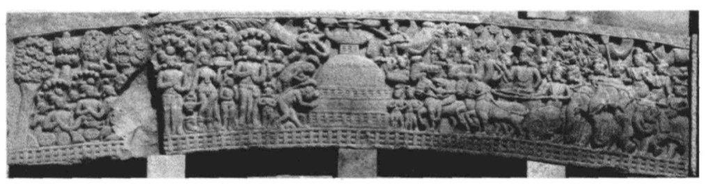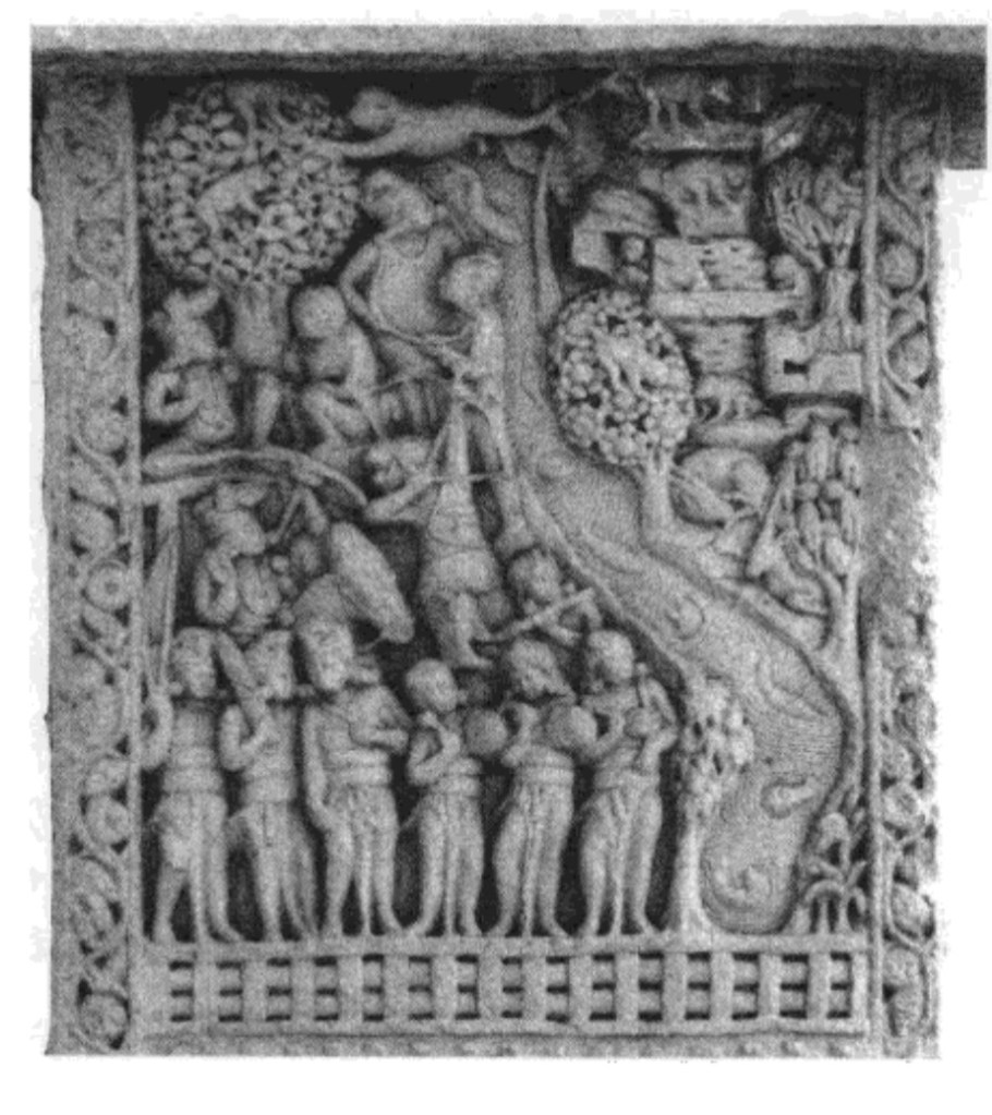 佛陀伏魔外道 西門背面下橫梁 中央菩提樹,四層聖殿(阿育王在菩提迦耶建的正覺寺),殿內金剛座,作為佛陀在此成等正覺的象徵。左邊天神慶祝,高舉三义旗幡與花環、揮舞衣巾、敲鑼打鼓。聖殿旁恭敬合掌的是領袖:帝釋天或梵天。右邊是魔軍,靠近聖殿的四魔手持長槍利斧,猛烈進攻。最上方是耳上掛環,張牙舞爪地咆哮。他們身後是潰敗場面,士兵亂成一團,遭馬車輾過,險些摔下馬,將來三义戟從同伴身體拔出。到最右邊,魔軍終於停下來喘息的,有的累得臥倒地上,有的互相攙扶,有的光著臀部。