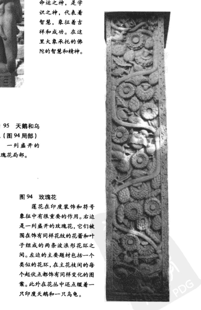 女人和蓮花 東門右邊下部的支撐和左邊上部的支撐都有一個單腿垂下的女性坐像,下面是從一花瓶中冒出的蓮花。手中握着同樣的蓮花,身兩旁各有一朶蓮花,上立一大象向她噴水,象牙帶大水罐。這個圖像出現在財神造像中,但應不是最初含意。