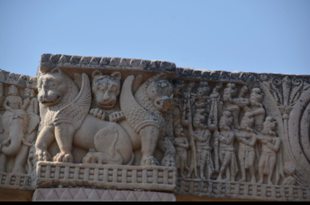 獅子柱頭 南門上的四只一組背對背的。這種灰色硬質岩石上帶有麻點,但打磨得光滑,石質顯得透過如玉石一般。這個雕刻帶希臘風味。