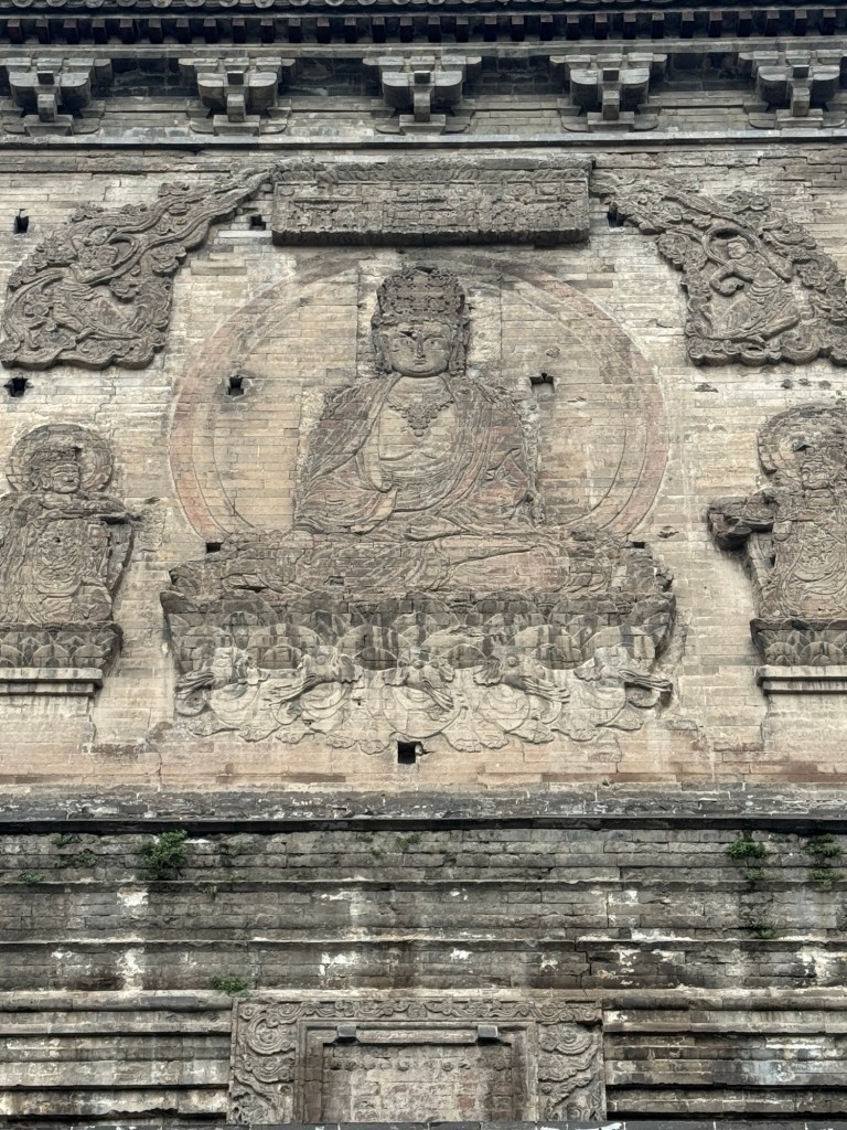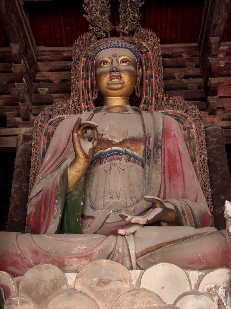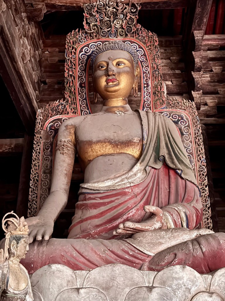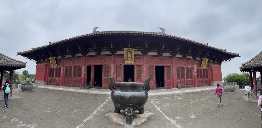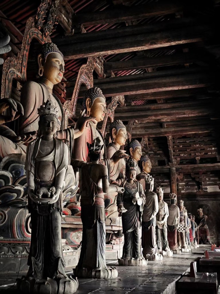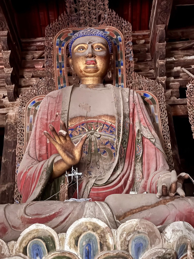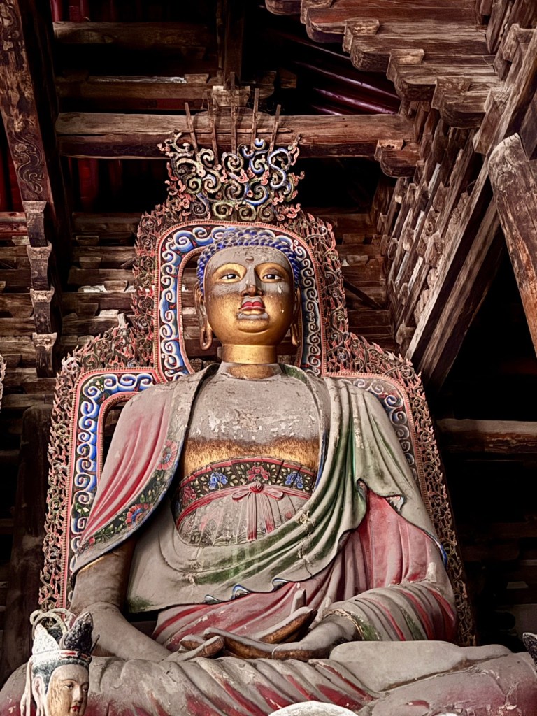 大雄寶殿保存得甚好,那八九米高的泥塑七佛保存得頗完整,歷煉千年,難得. 為什麼供奉七佛?有很多說法,其中之一是代表七位皇帝。釋迦牟尼佛象徵在世的遼聖宗,其他六尊代表他之前的六位皇帝,所以釋迦牟尼佛的頭略向西轉,以此區別。又有說法是遼聖宗極喜歡他的母親,皇太后也有一尊像在東北方,因此他向西南望便可以直接和到他的母親對望。