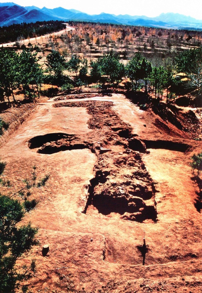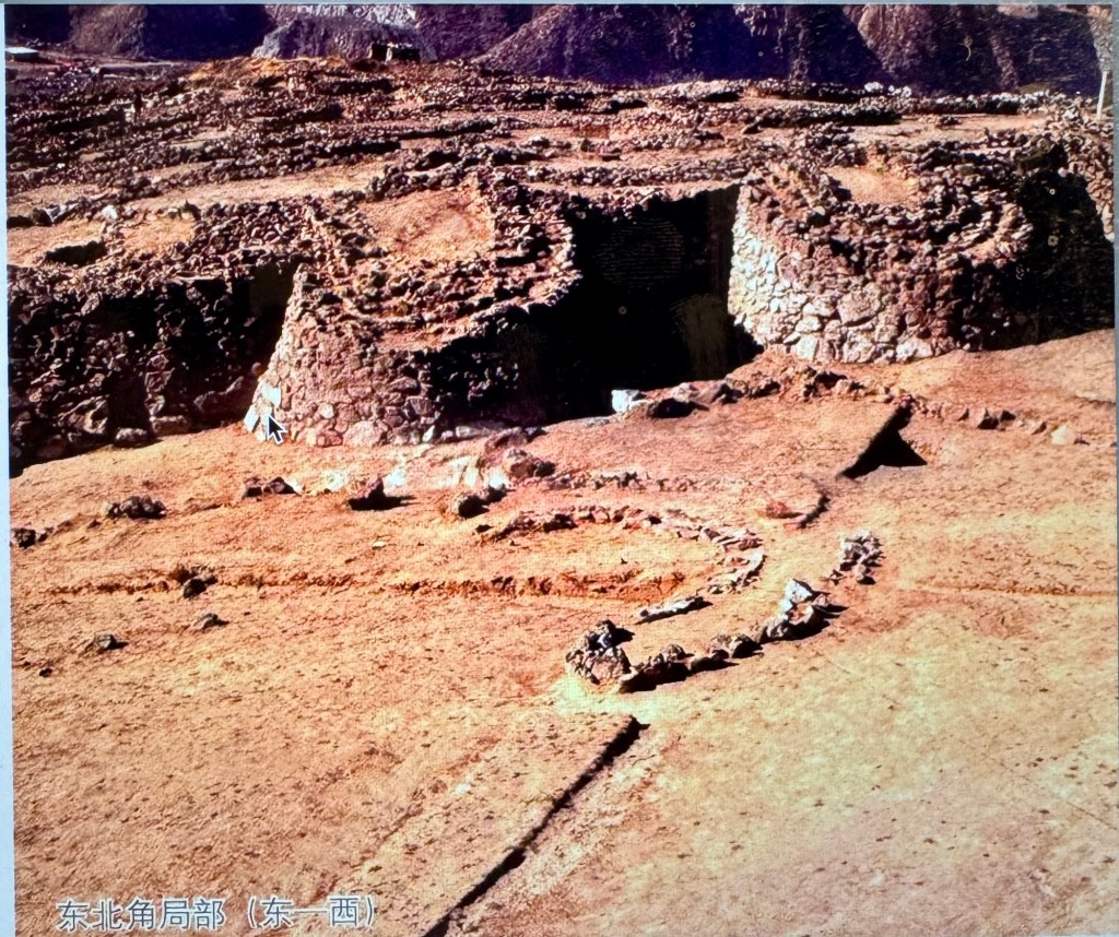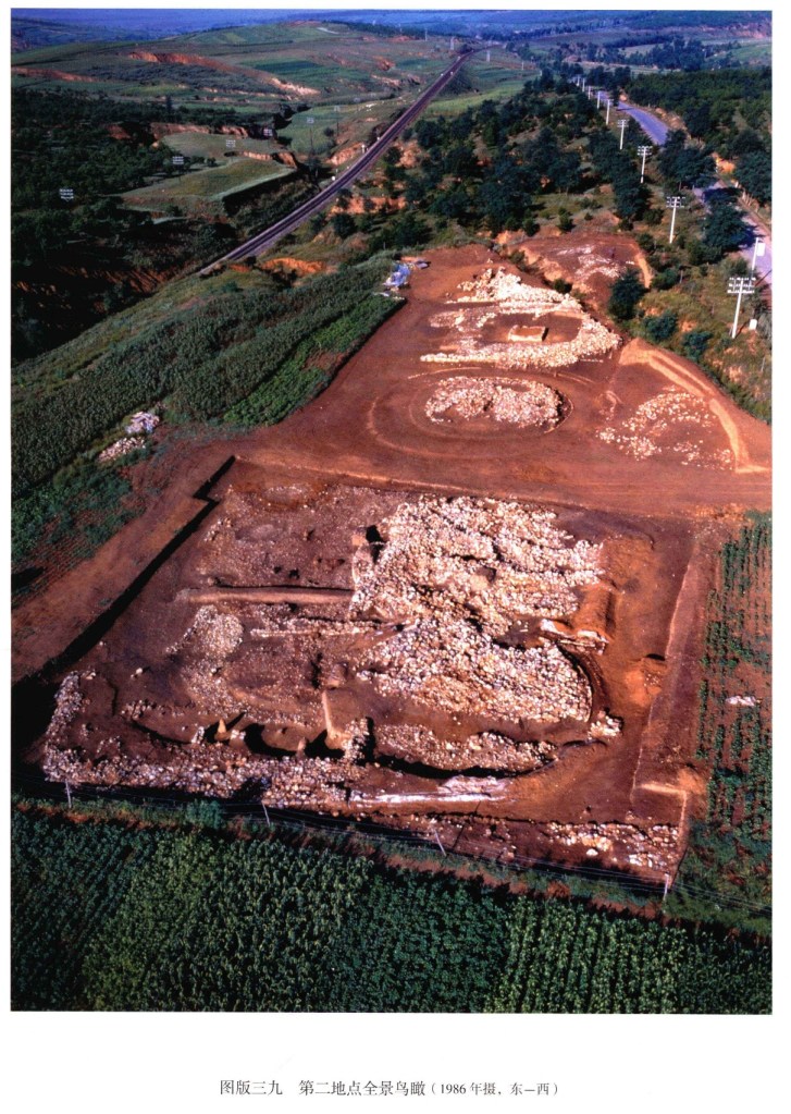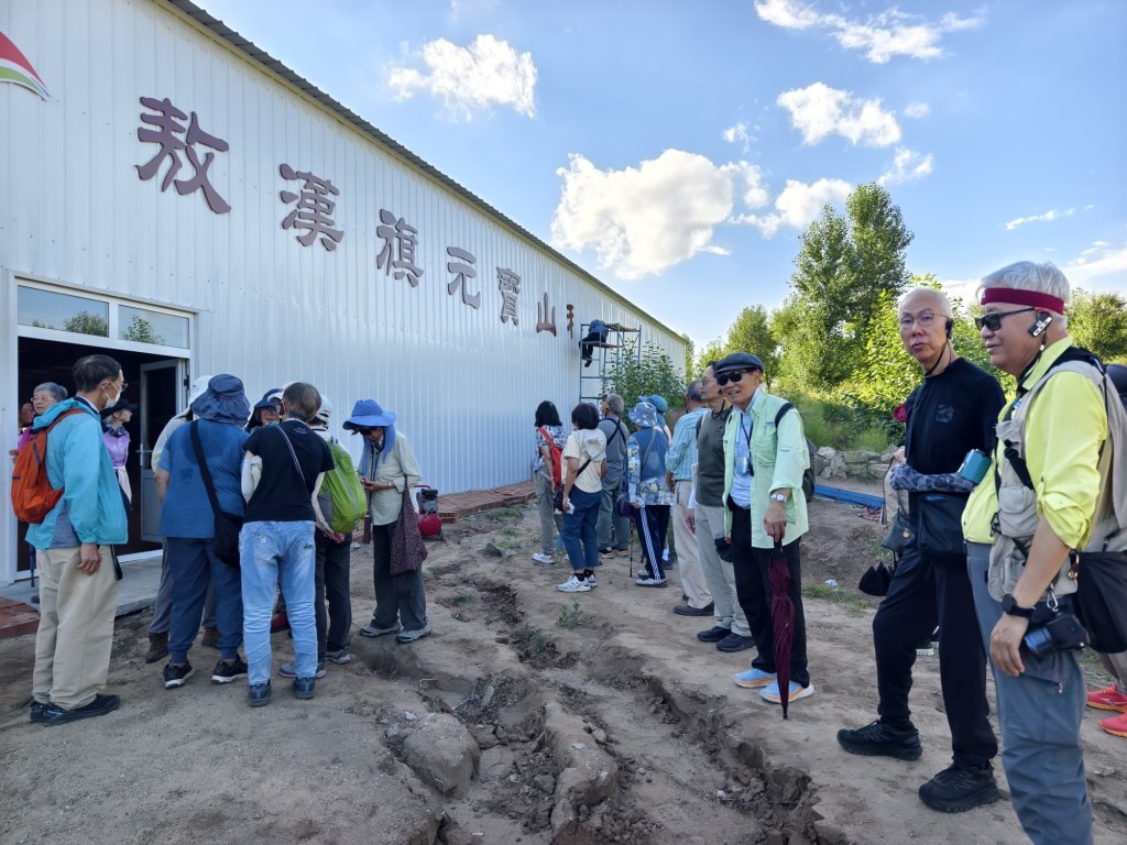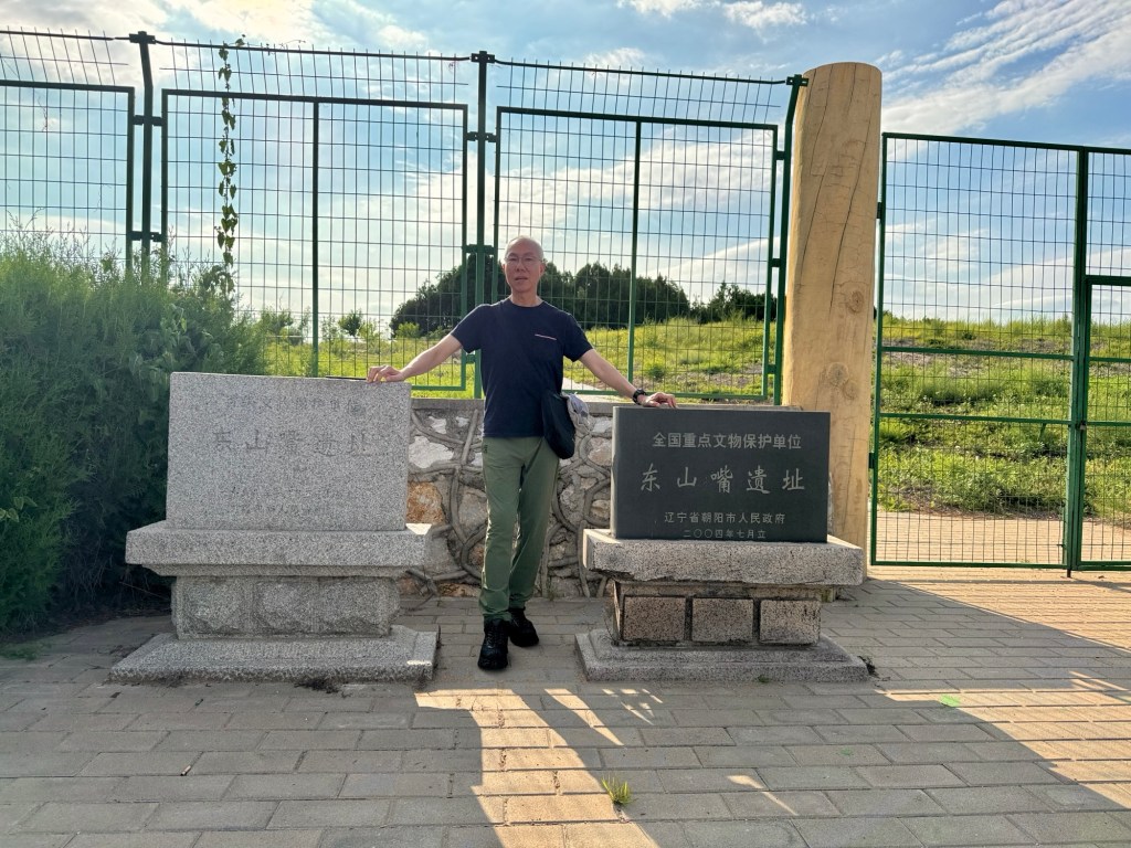 下午改了行程,不去興隆窪而去元寶山積石塚,大家都很興奮,因為這個遣址仍在發掘中,還沒有對外開放。踏入剛用鐵皮屋保護起來的紅山遺扯,北㘣南方清晰可見,感慨萬分,可惜不可以拍照。
