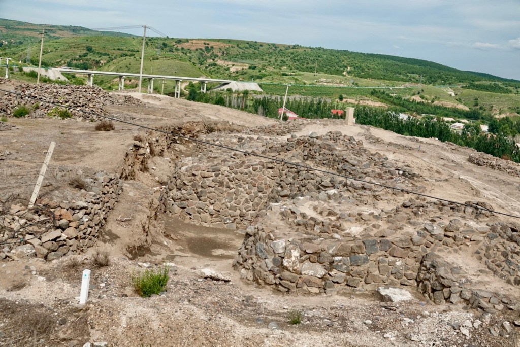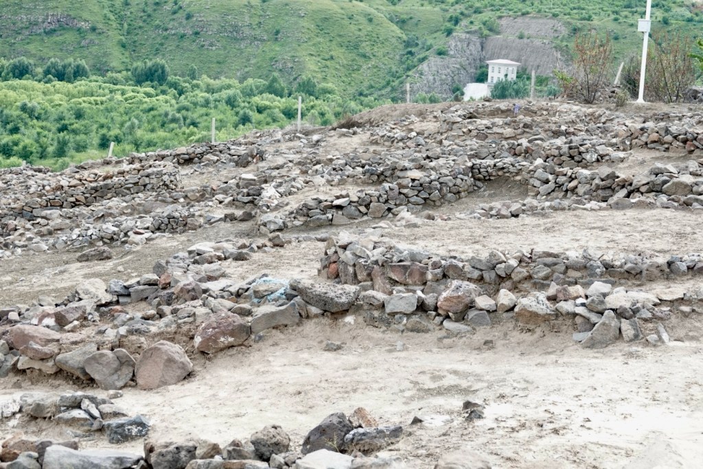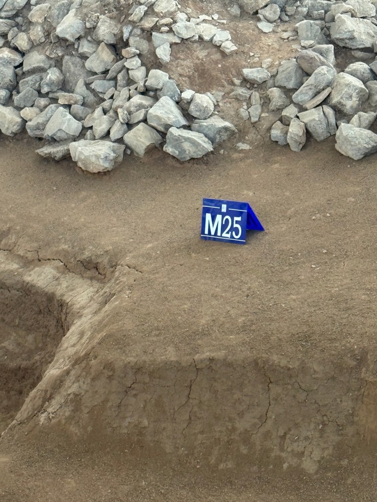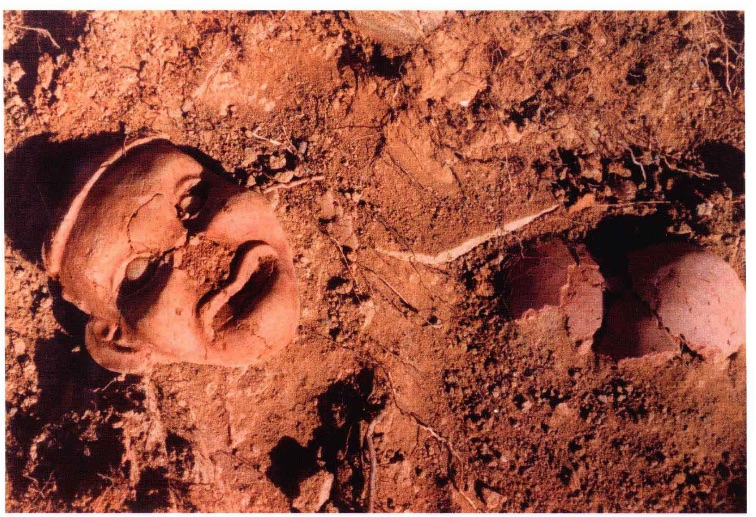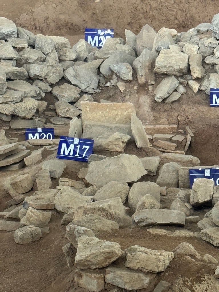 下午改了行程,不去興隆窪而去元寶山積石塚,大家都很興奮,因為這個遣址仍在發掘中,還沒有對外開放。踏入剛用鐵皮屋保護起來的紅山遺扯,北㘣南方清晰可見,感慨萬分,可惜不可以拍照。