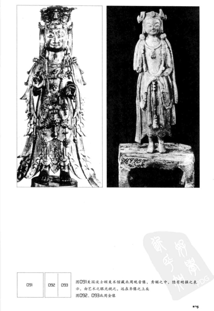 北周一觀音像是極品,現藏波士頓,高八尺余,立蓮花上,四獅蹲四隅拱衛。左執蓮蓬,右手下垂,持物已毀。衣褶流暢,全身環珮極多。肩上袈娑自兩旁下垂,飄及于地。寶冠亦以珠環作飾,頂有小佛。企立姿勢自然,首微向前伸,腰微轉側。秀媚之中又帶剛強,藝術上遠在北齊之上。北周开始天衣突出于肩膊外。