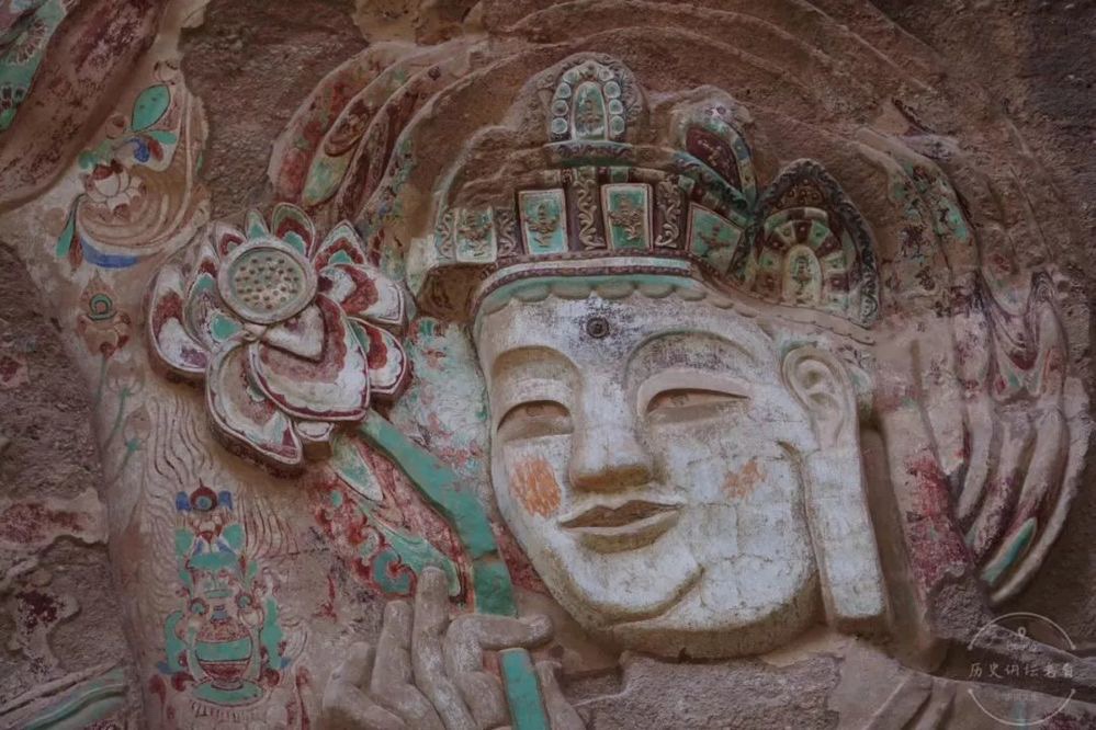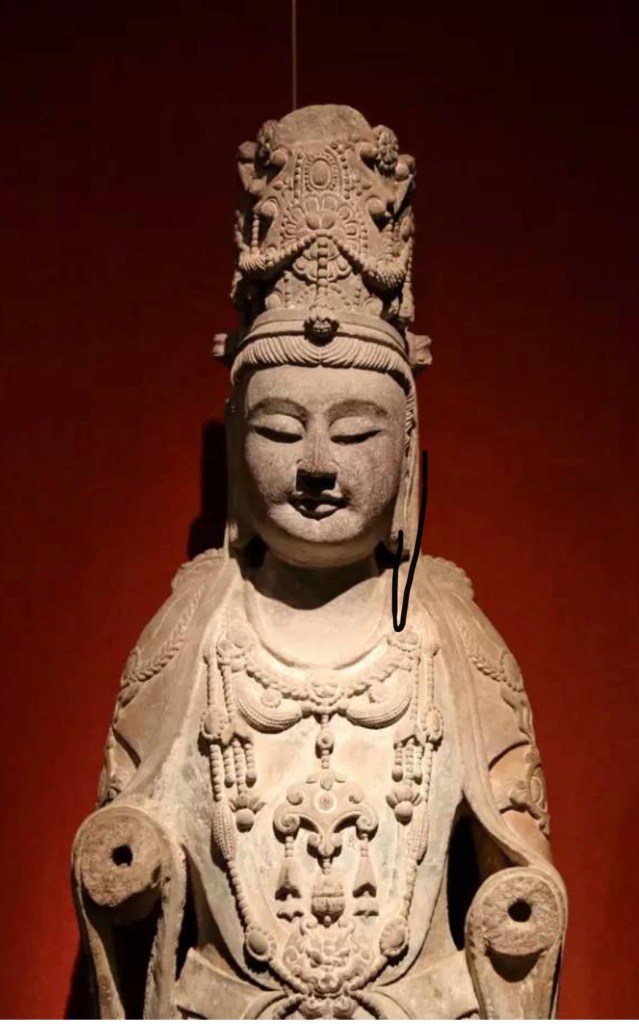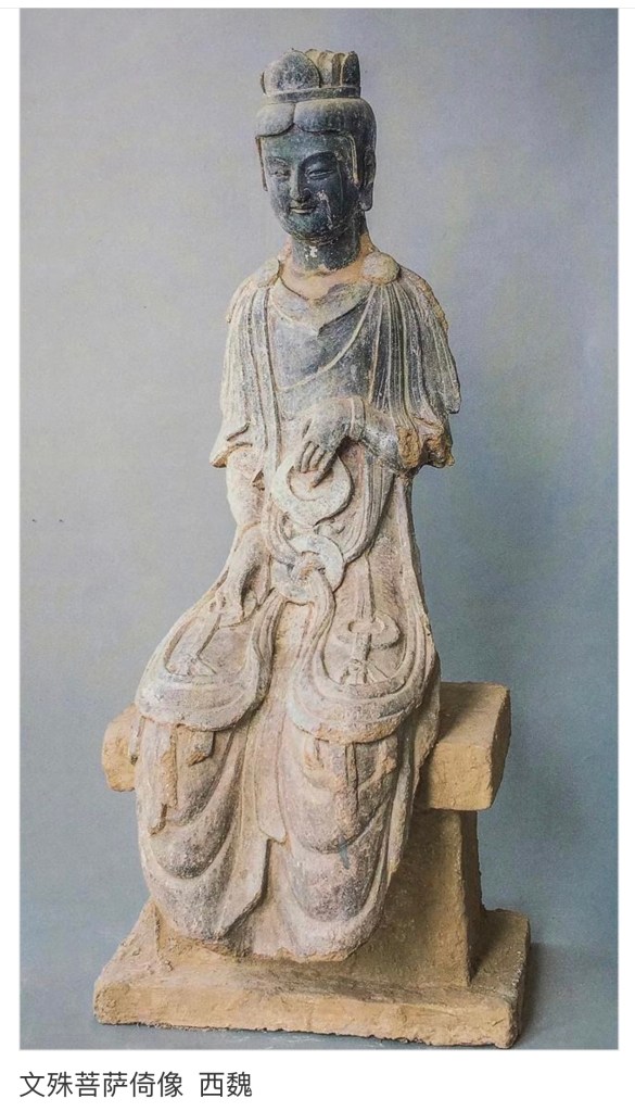 璎珞交义 with a ring 是由北魏开始,飞纤垂siu 开始有,西魏更明显。 雲岡石窟的菩蕯見不到印度影響,完全沒有公主般打扮,幾乎沒有裝飾,只戴簡單的頭巾和一個心形項圈。有長長的肩帶,穿過在大腿前的環。