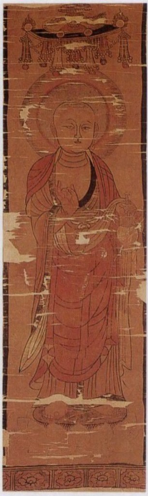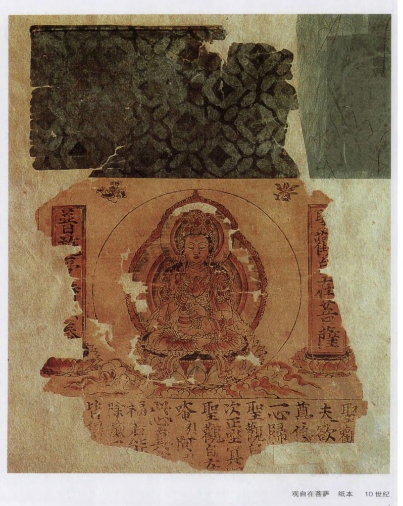 敦煌藏經洞紙本觀自在菩薩 不同一般立姿形象,極為少見。整體設計着重于圓心主軸的開展。端坐蓮台上,雲的造型是從下湧上,即是雲集瑞相之景。右側寫:聖觀自在菩薩,左為:普施受持供養。